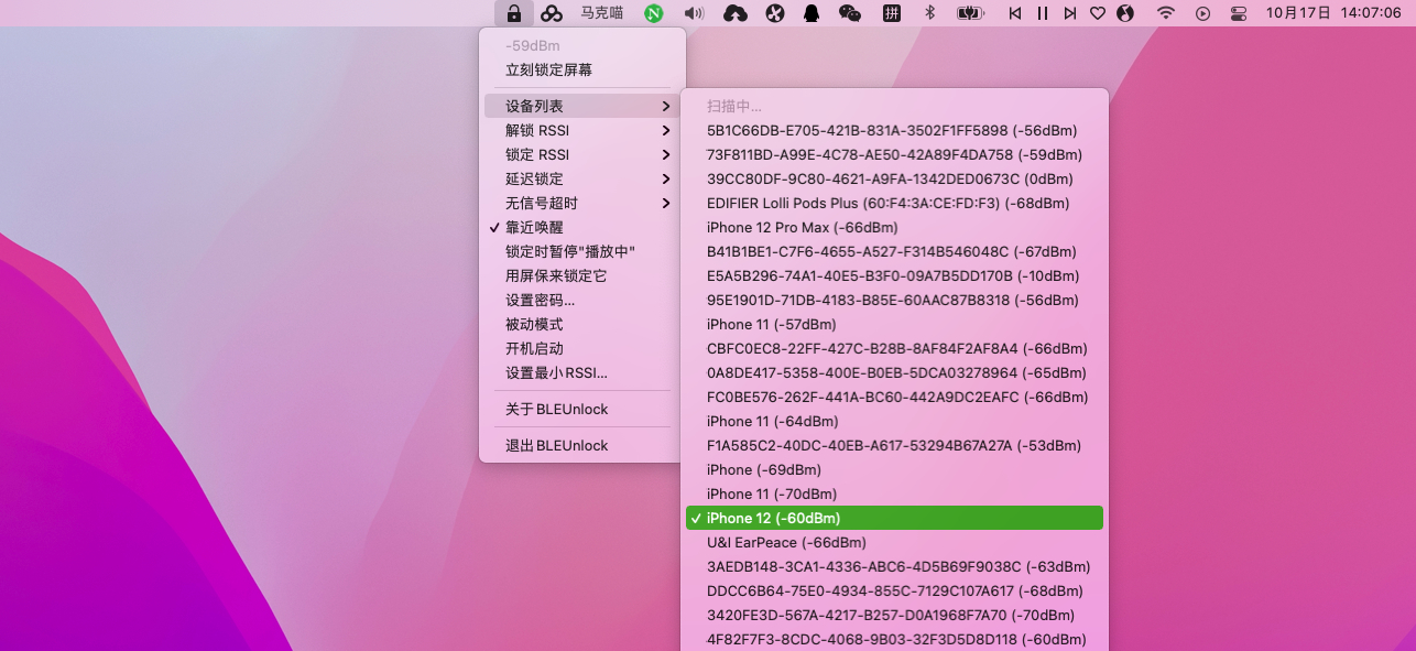 BLEUnlock 是搜集到的一款通过蓝牙设备解锁或锁定Mac的应用。可以帮助您借助 iPhone、Apple Watch、安卓手机等任何支持蓝牙低功耗的设备进行锁定和解锁Mac。