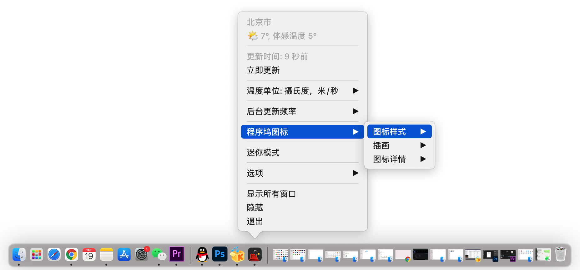 我们认为 Mac 桌面上的程序坞是一个展示天气信息的好地方,尤其是在视网膜显示器上。当你启动迷你天气时,无论主窗口是打开还是关闭,程序坞中的应用图标都会像主窗口一样,显示同样漂亮的天气插图和当前温度。