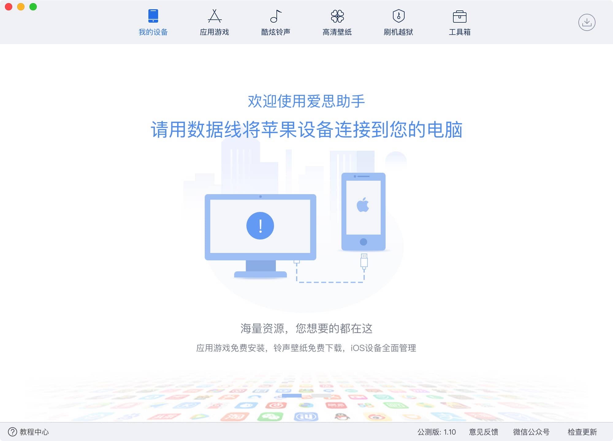 爱思助手 for mac v1.10.018 是搜集到的一款 ios设备管理工具,爱思助手 for mac可以免越狱安装应用和游戏,同时可以备份数据、下载壁纸和铃声。