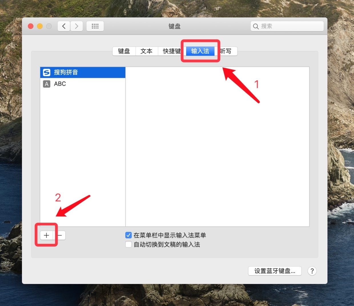 2、在「键盘」的设置窗口里,点击顶部的「输入法」一栏,接着点击窗口左下角的「+」按钮,以添加新的输入法;