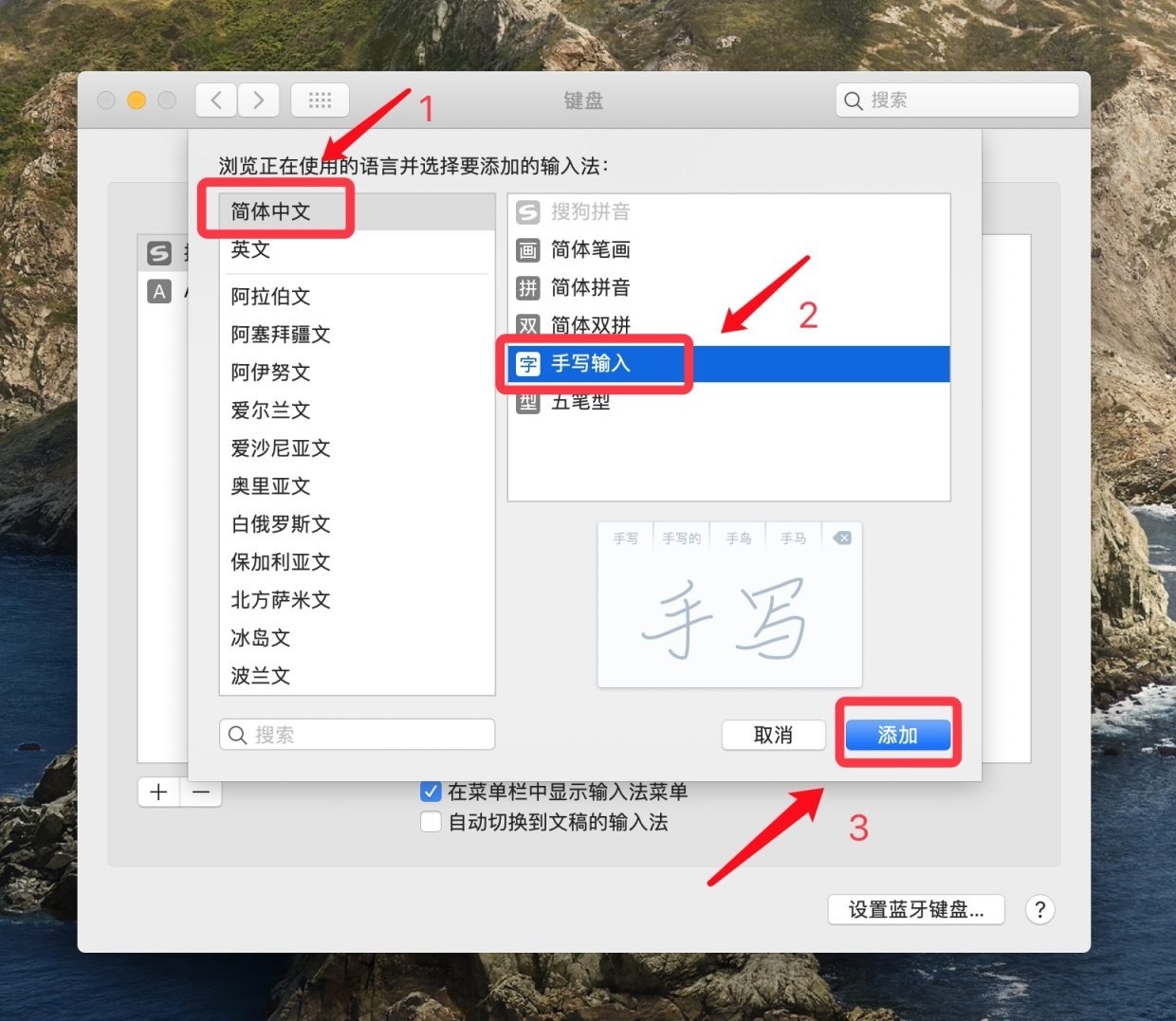 3、随后在弹出的选择框左侧的「简体中文」列表里,找到并添加「手写输入」;