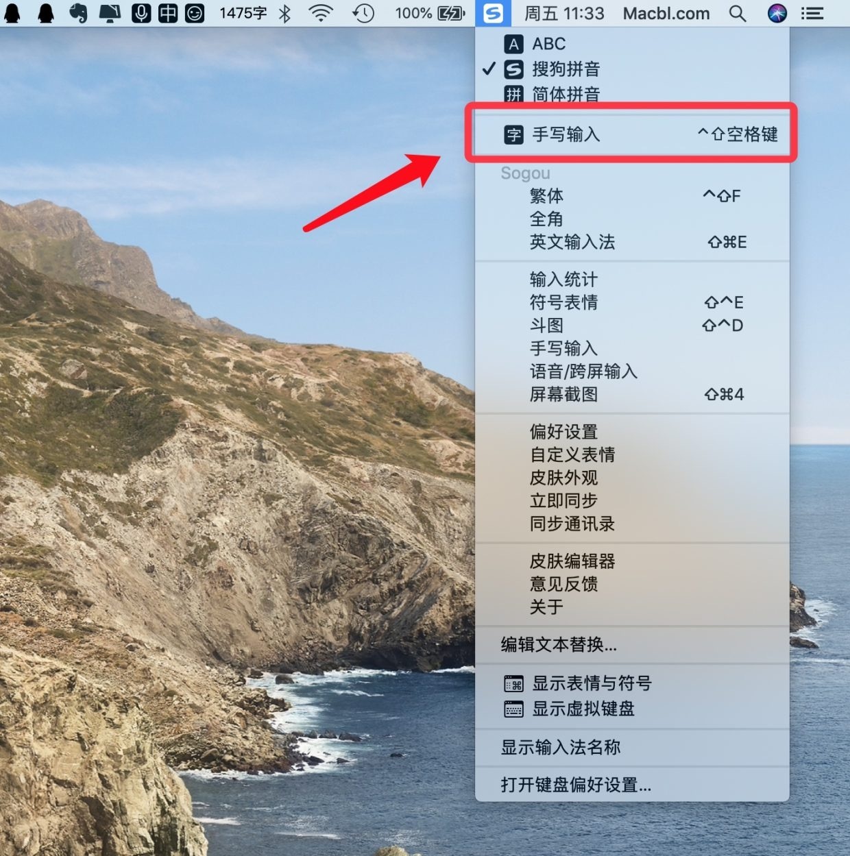 4、接下来,点击桌面顶部的输入法菜单栏,选择「手写输入」选项,也可以通过键盘快捷键「Ctrl + Shift + 空格」来打开手写输入;