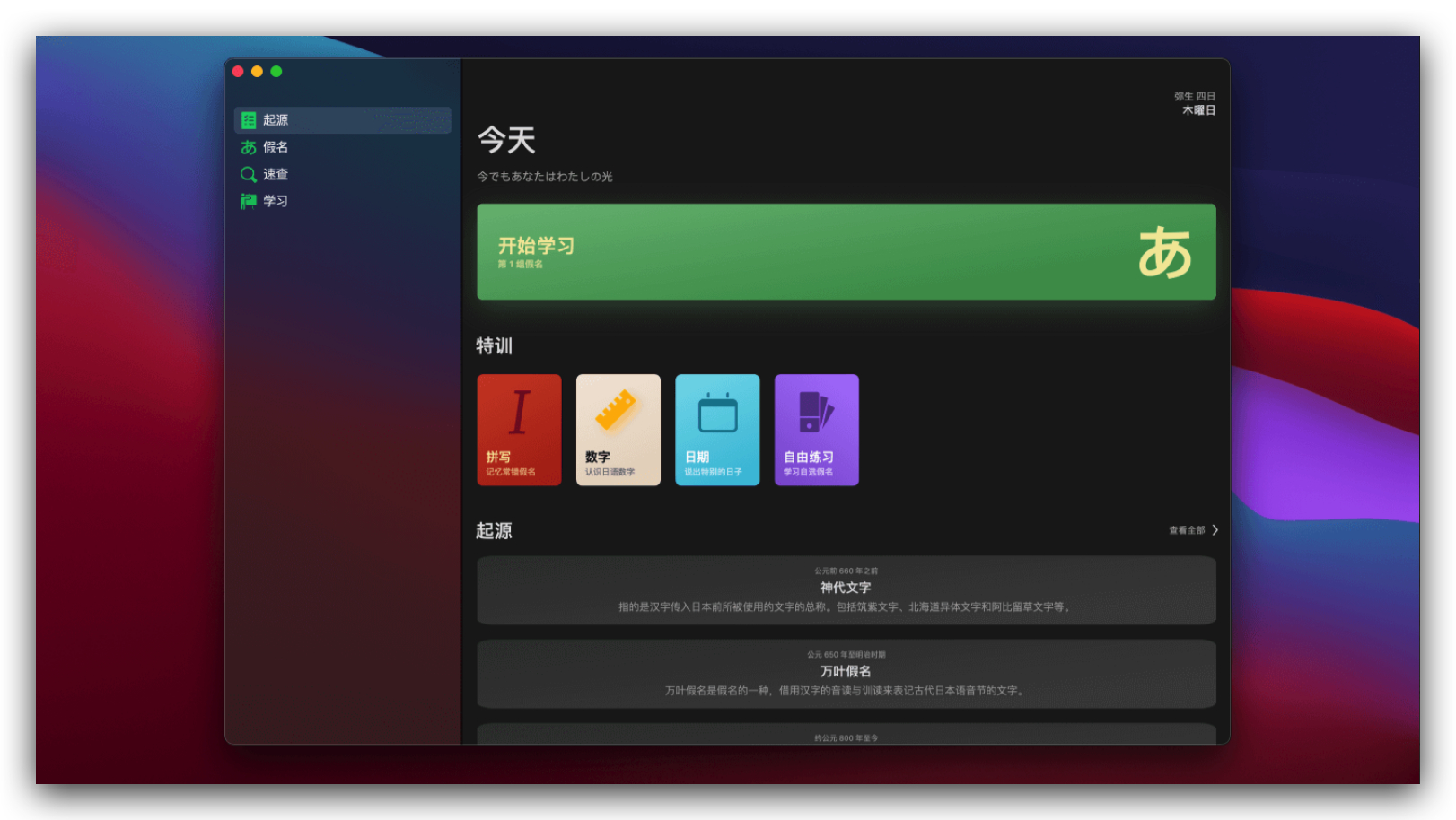 50 音起源是一款日语学习类 Mac 应用。从起源开始学习日语五十音与单词,带你了解日文假名的由来,以及与汉字的渊源,帮助你更好的理解,区分这些假名。速查表可以快速找到那个你想了解的假名,日期与数字。