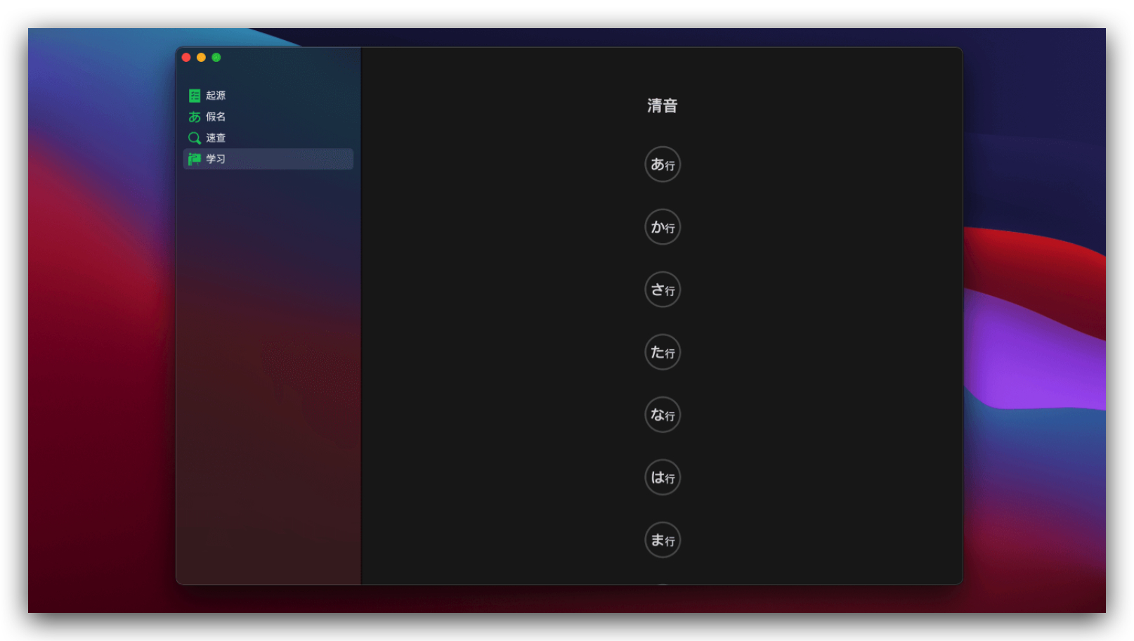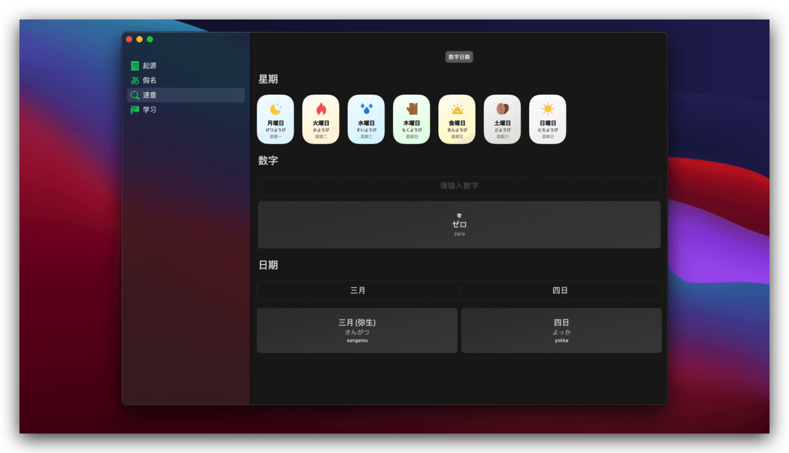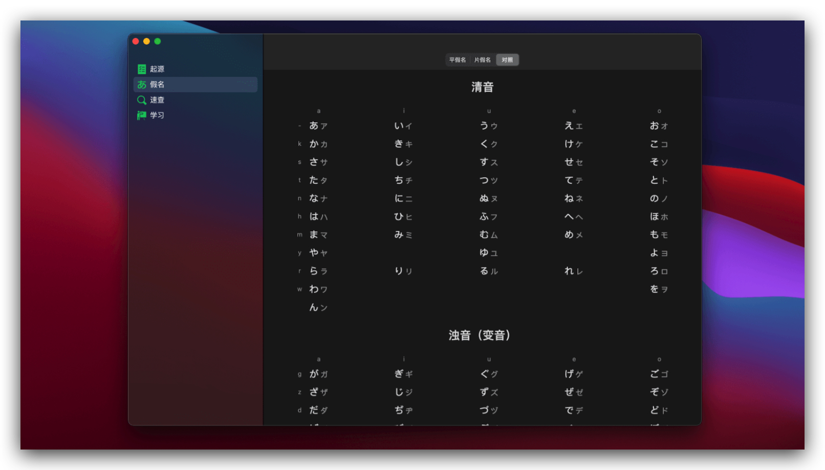 50 音起源是搜集到的一款日语学习类 Mac 应用。从起源开始学习日语五十音与单词,带你了解日文假名的由来,以及与汉字的渊源,帮助你更好的理解,区分这些假名。速查表可以快速找到那个你想了解的假名,日期与数字。