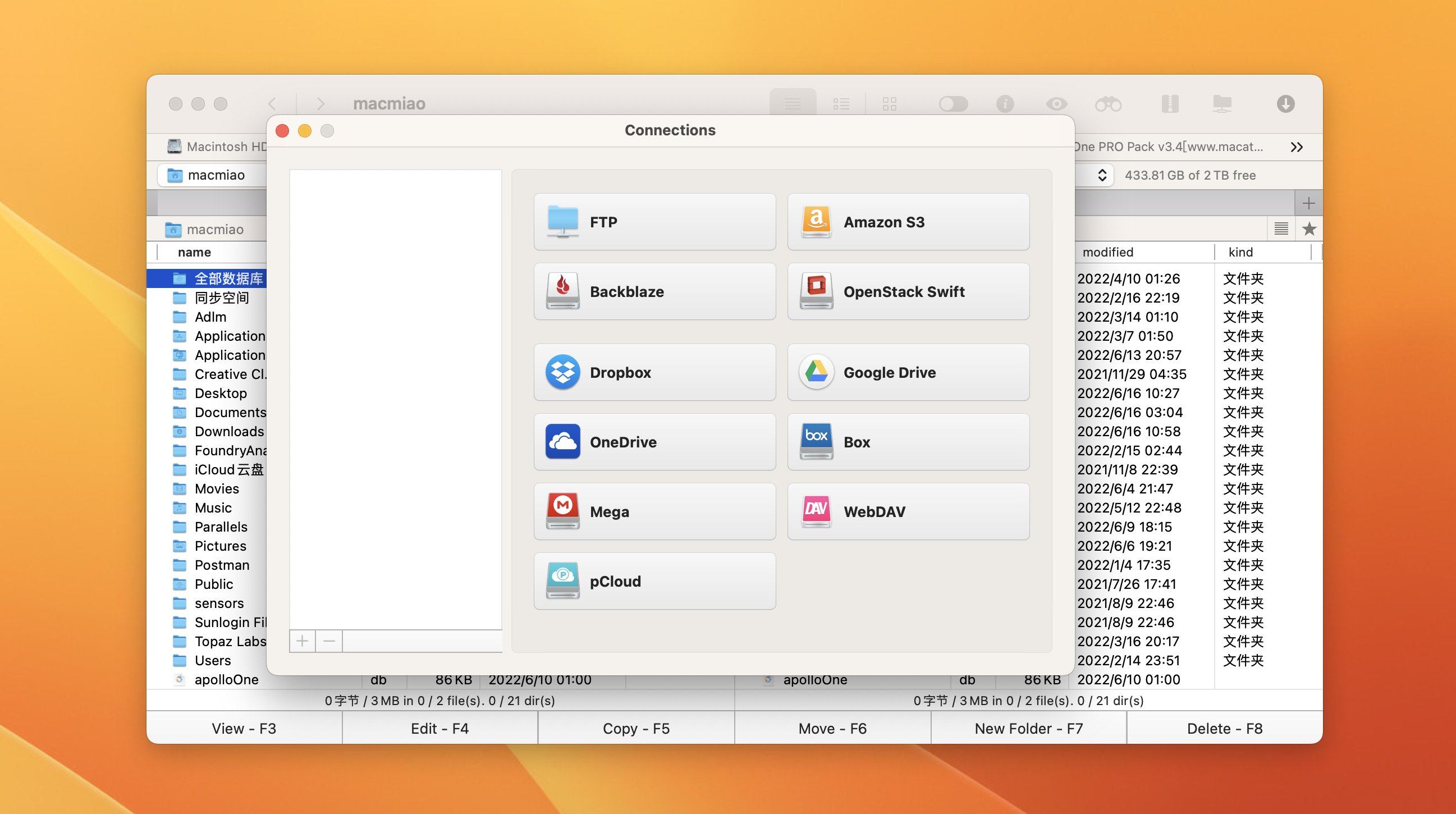 将您的存储与Commander One连接起来。您可以使用在线文件,就像它们保存在硬盘上一样。