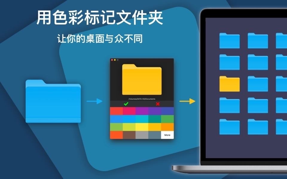ColorFolder 是macOS下改变文件夹的颜色的软件,它可以自由变更访达的文件夹图标颜色,能让你的文件夹更赏心悦目,使桌面与众不同。
