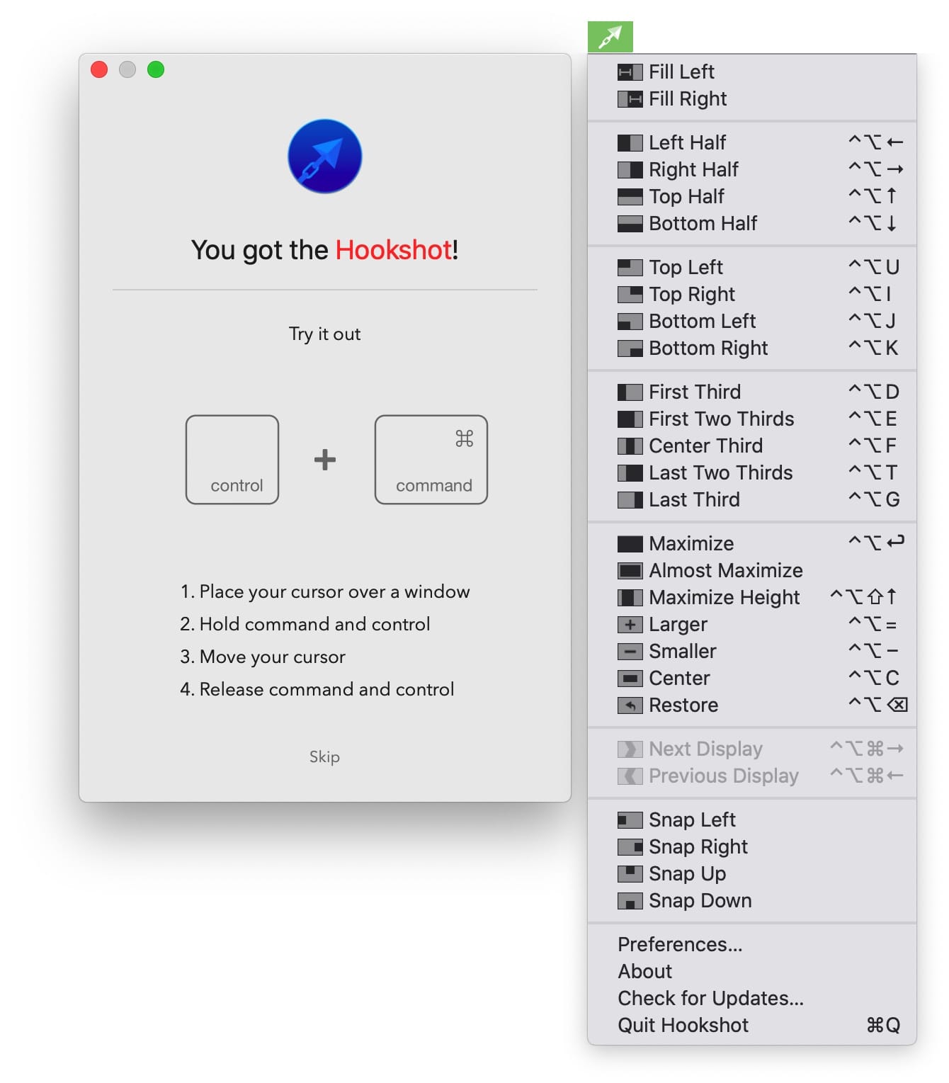 搜集到的Hookshot 是一款 Mac窗口管理工具。通过 Hookshot 可以帮助您调整窗口所在屏幕的位置,让您的工作桌面变得整整齐齐。