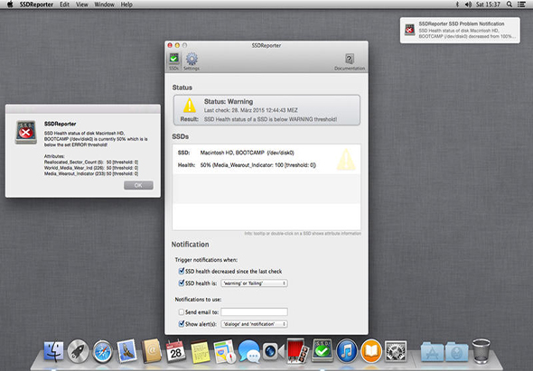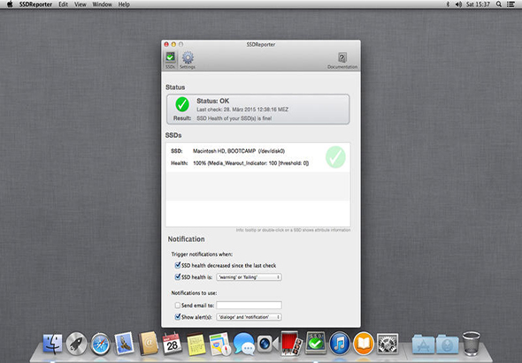 SSDReporter Mac版能检查你的内部固态硬盘的健康(“SSD”又名“闪存”)。由于固态硬盘有一个有限的生命的数量的确定的写操作要留意你的SSD地位重要。SSDReporter可以警告你通过电子邮件或屏幕上的每一次健康你的SSD的降低和/或当健康低于“警告”或“错误”的门槛。你的SSD的现状也总是很容易辨认,因为SSDReporter改变它的图标(或者在菜单栏中)从绿色到黄色(警告阈值)和最后红(误差阈值)为SSD健康下降。