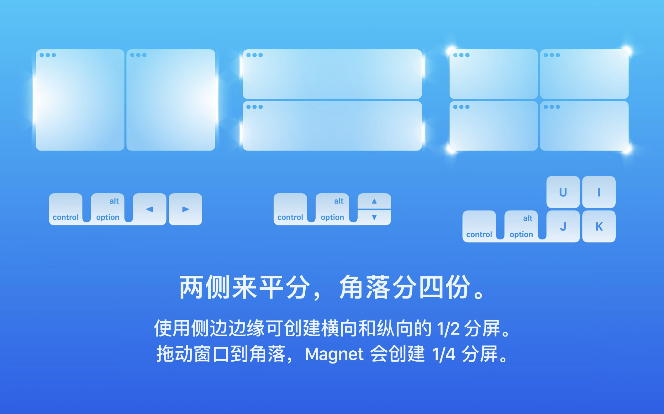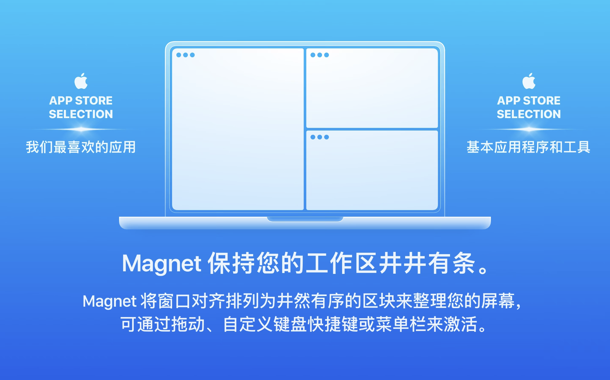 - 通过拖动,可自定义的键盘快捷键或通过菜单栏来激活,磁铁通过将窗口对齐到有组织的瓷砖来消除您的屏幕。复制,比较,多任务。