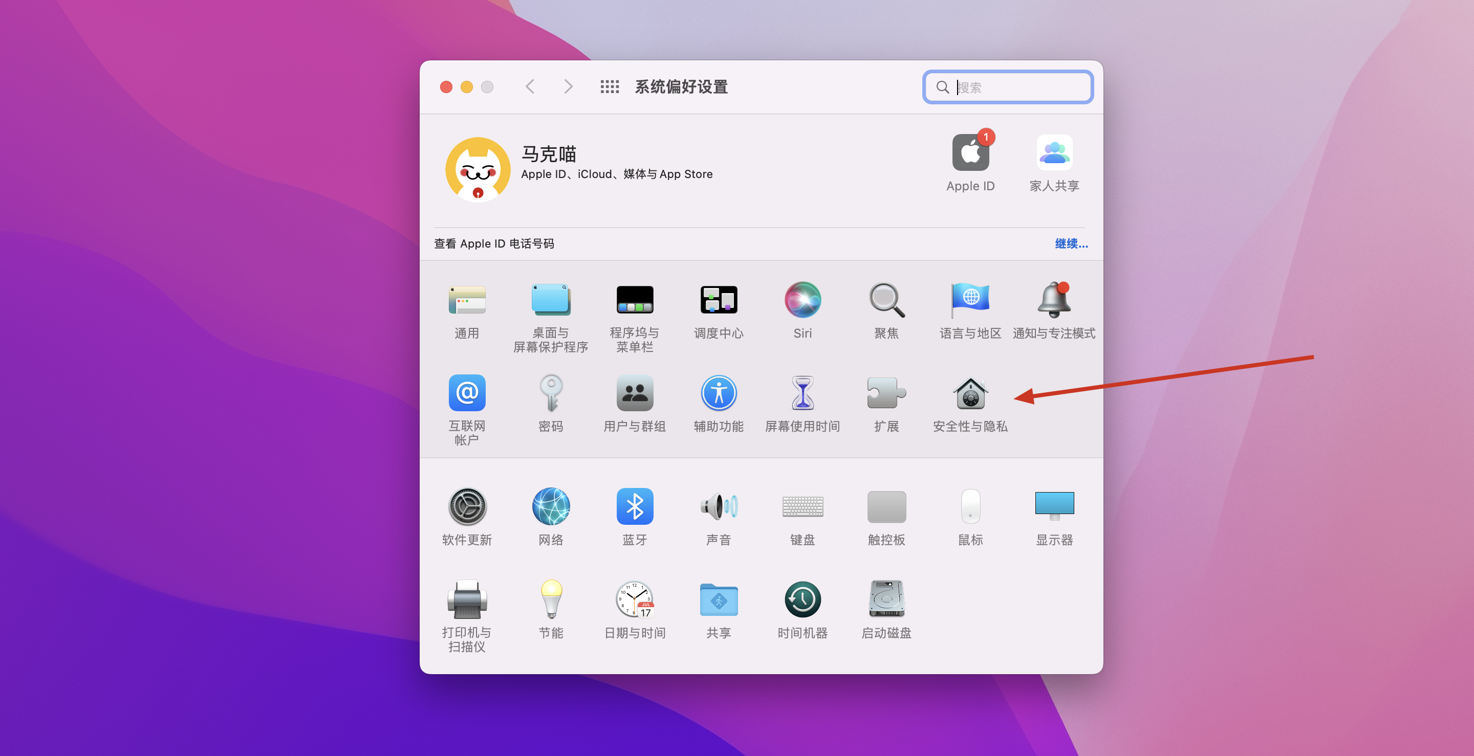打开系统偏好设置,找到安全与隐私,如图: