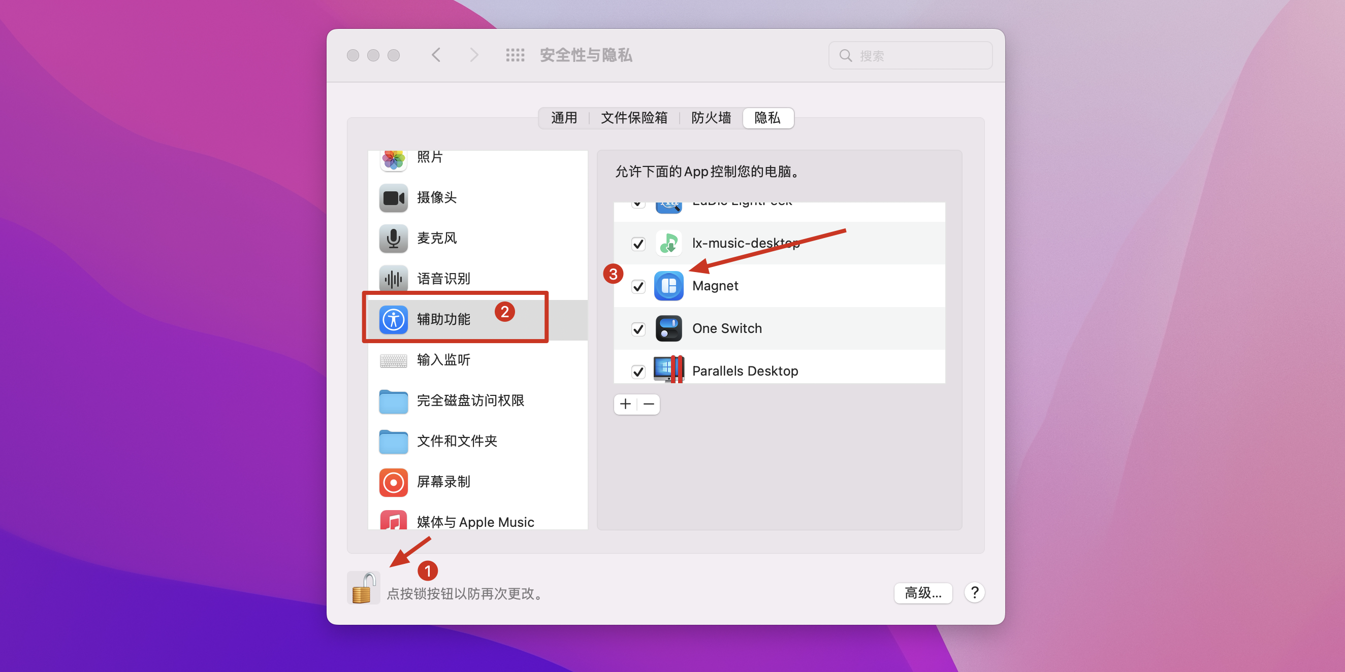 在辅助功能里找到Magnet软件,将对勾打上,权限设置成功,可放心使用!