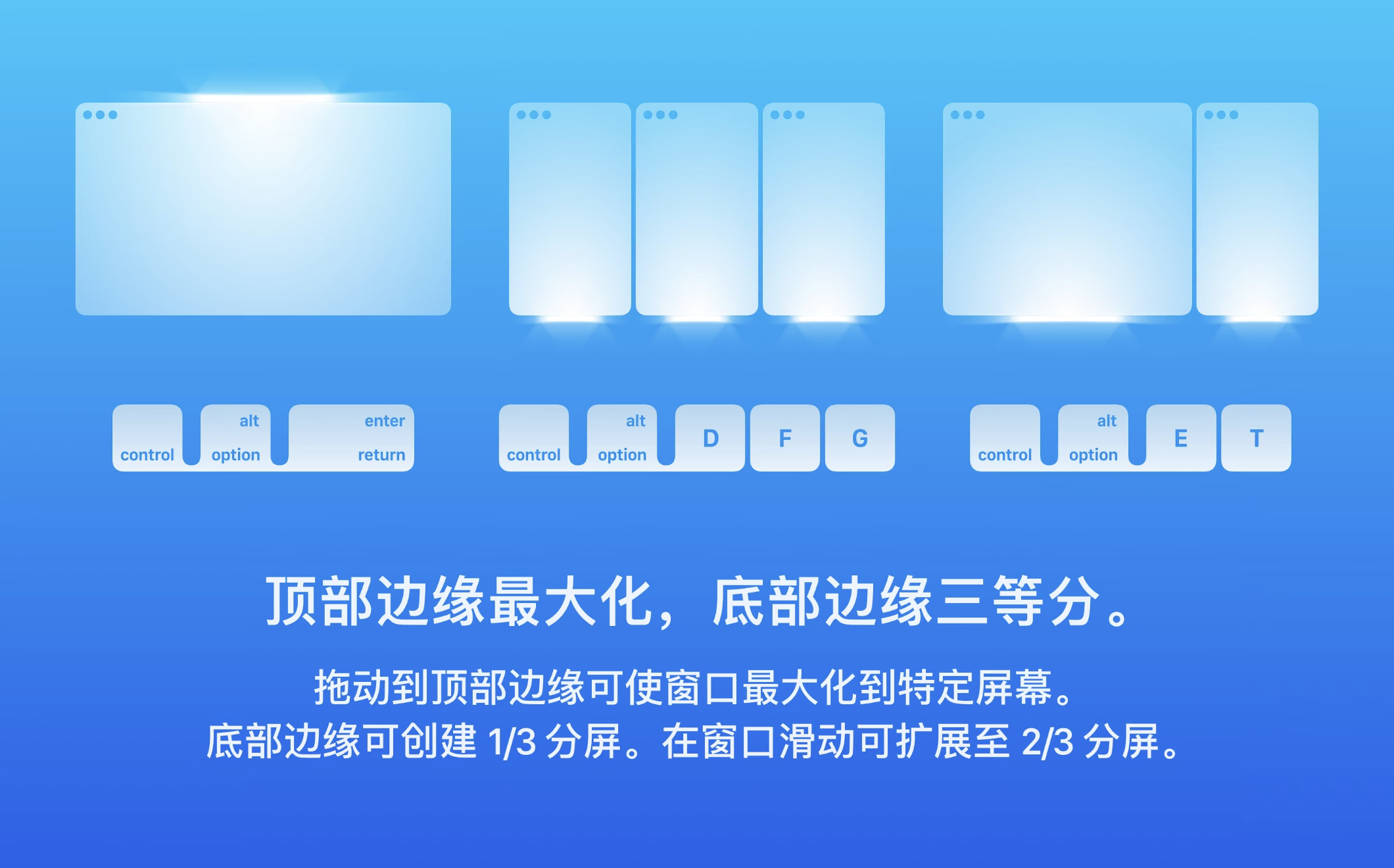 • 拖动到顶部边缘可以最大化给定屏幕上的窗口大小。底部边缘创建三分之一。将其放在三分之二处。