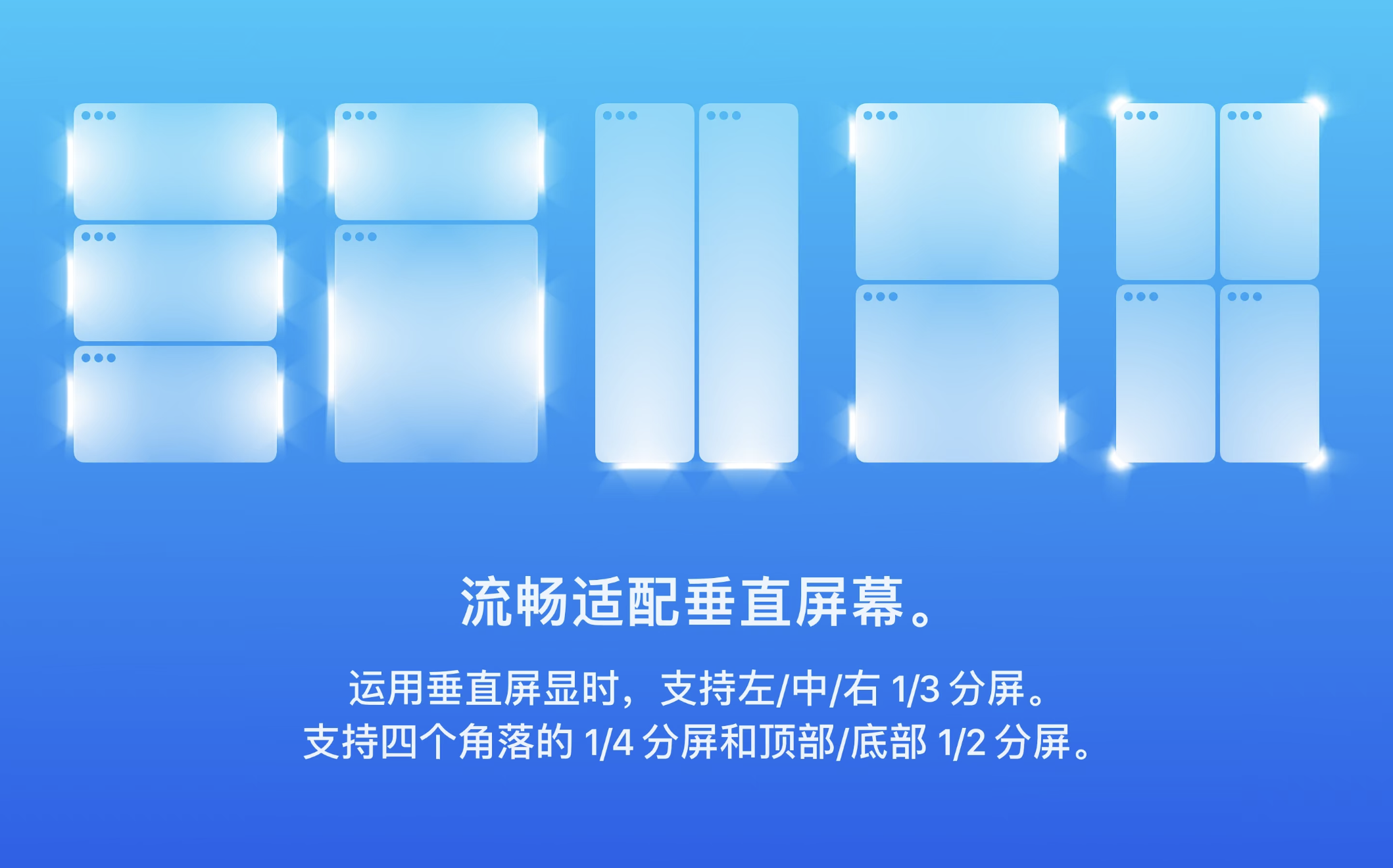 • 全屏,一半,四分之三和三分之一。最多支持六个外部显示器。潜在的组合是无止境的。