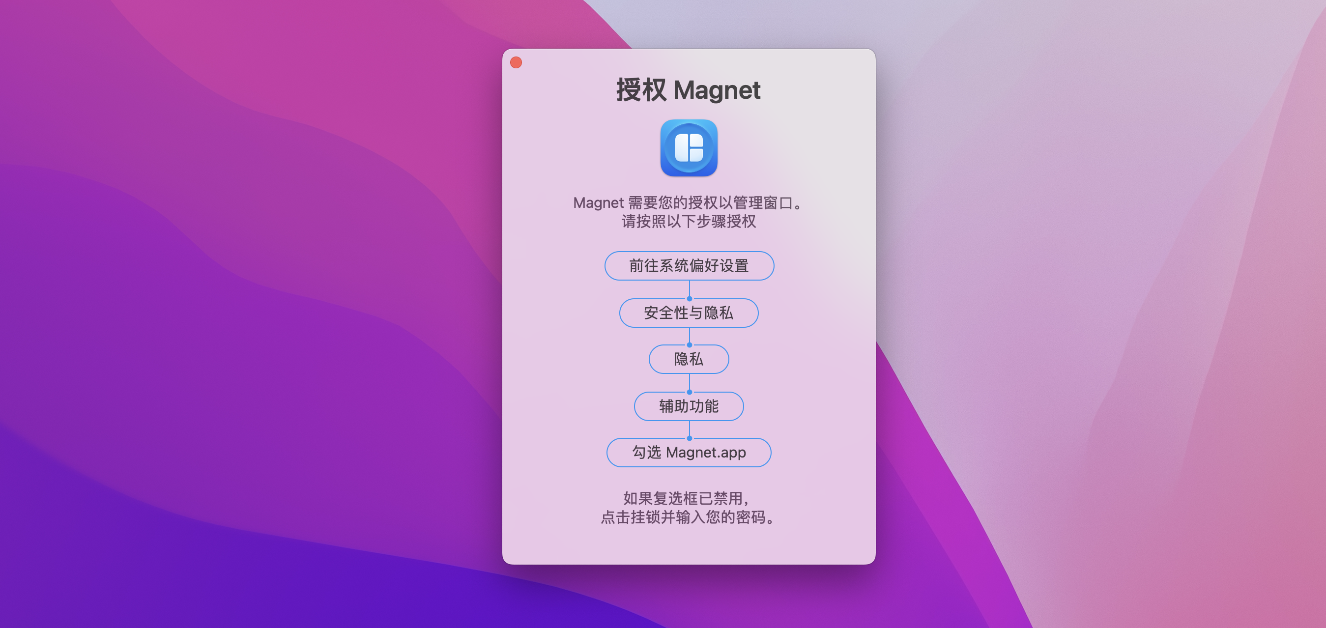 在辅助功能里找到Magnet软件,将对勾打上,权限设置成功,可放心使用!