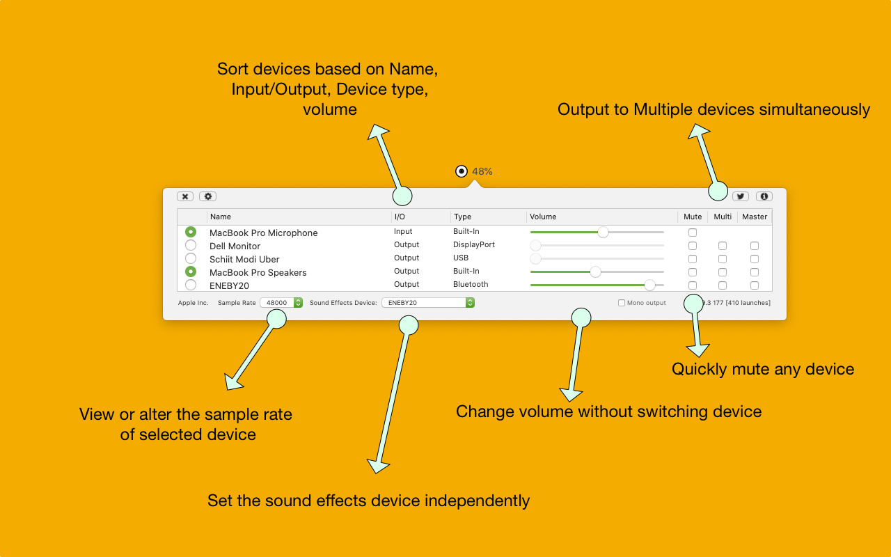 AudioSwitcher支持系统可用的任何设备:USB,HDMI,Thunderbolt,Bluetooth等。