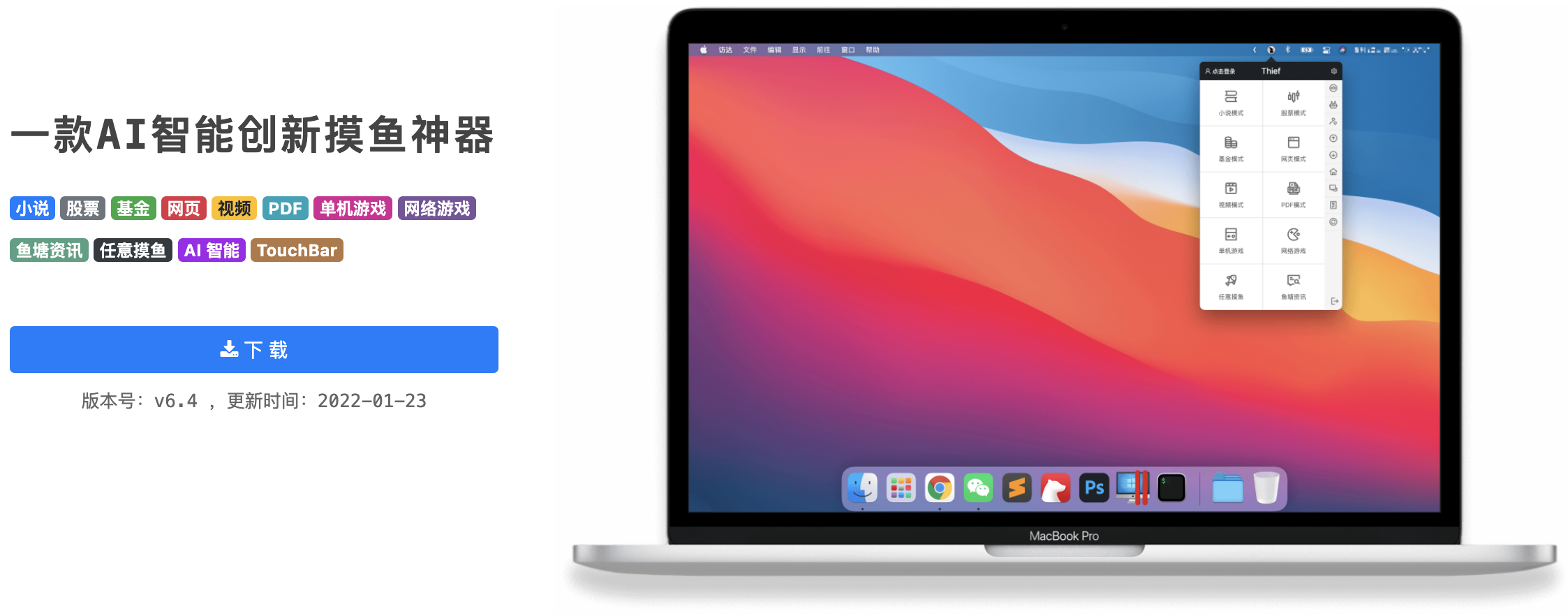 Thief 是搜集到的一款跨平台多功能(真正创新的)摸鱼软件,为了上班族打造的上班必备神器,使用此软件可以让上班倍感轻松,远离 ICU!