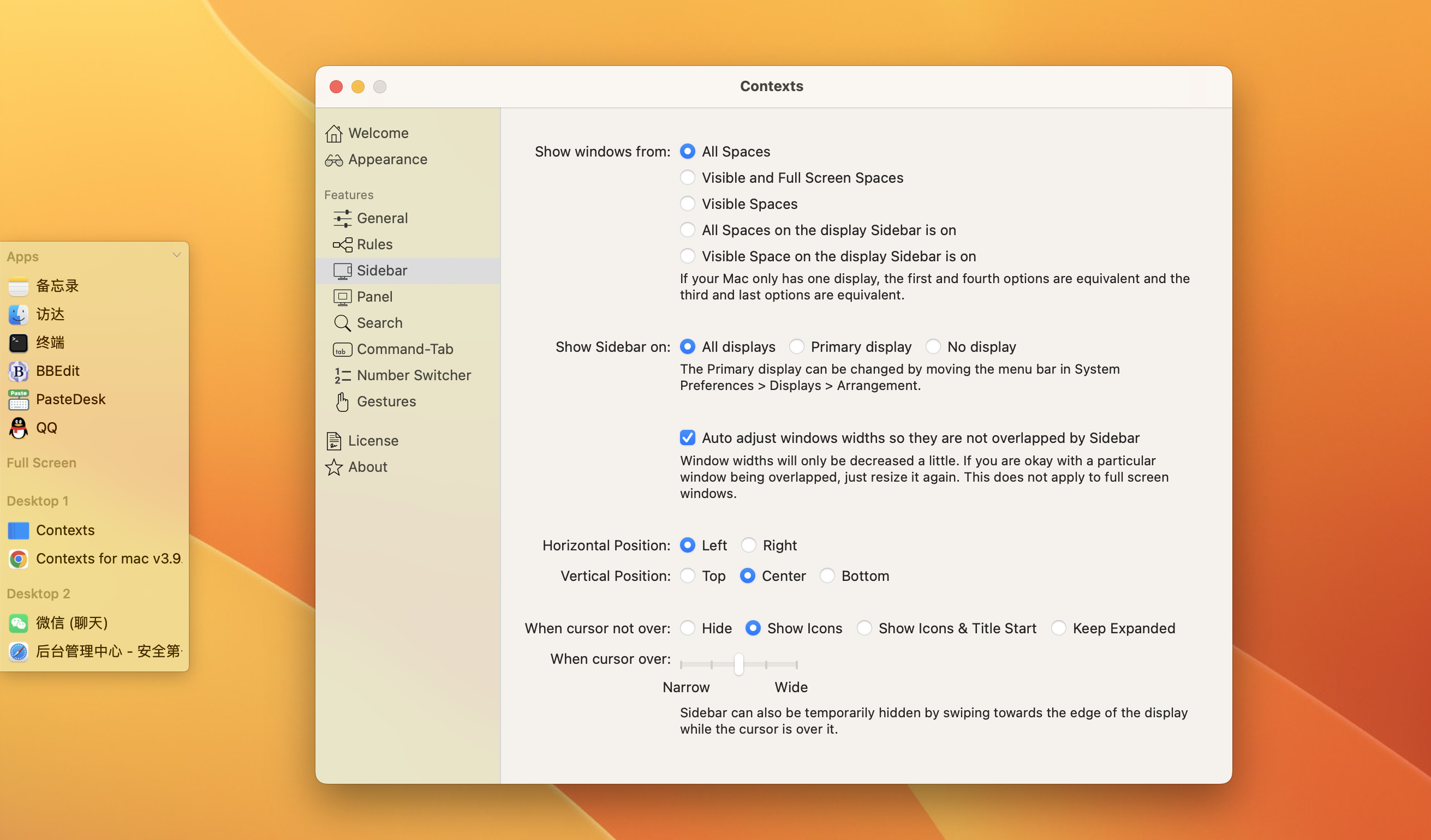 - Dock中的窗口预览太小,应用程序图标又比较多,这导致我们往往很难找到我们想要的窗口。Contexts则解决了这个问题,程序、窗口一目了然,所见即所得,更是可以通过快捷键调出我们想要的窗口,完美地弥补了Dock的缺陷。