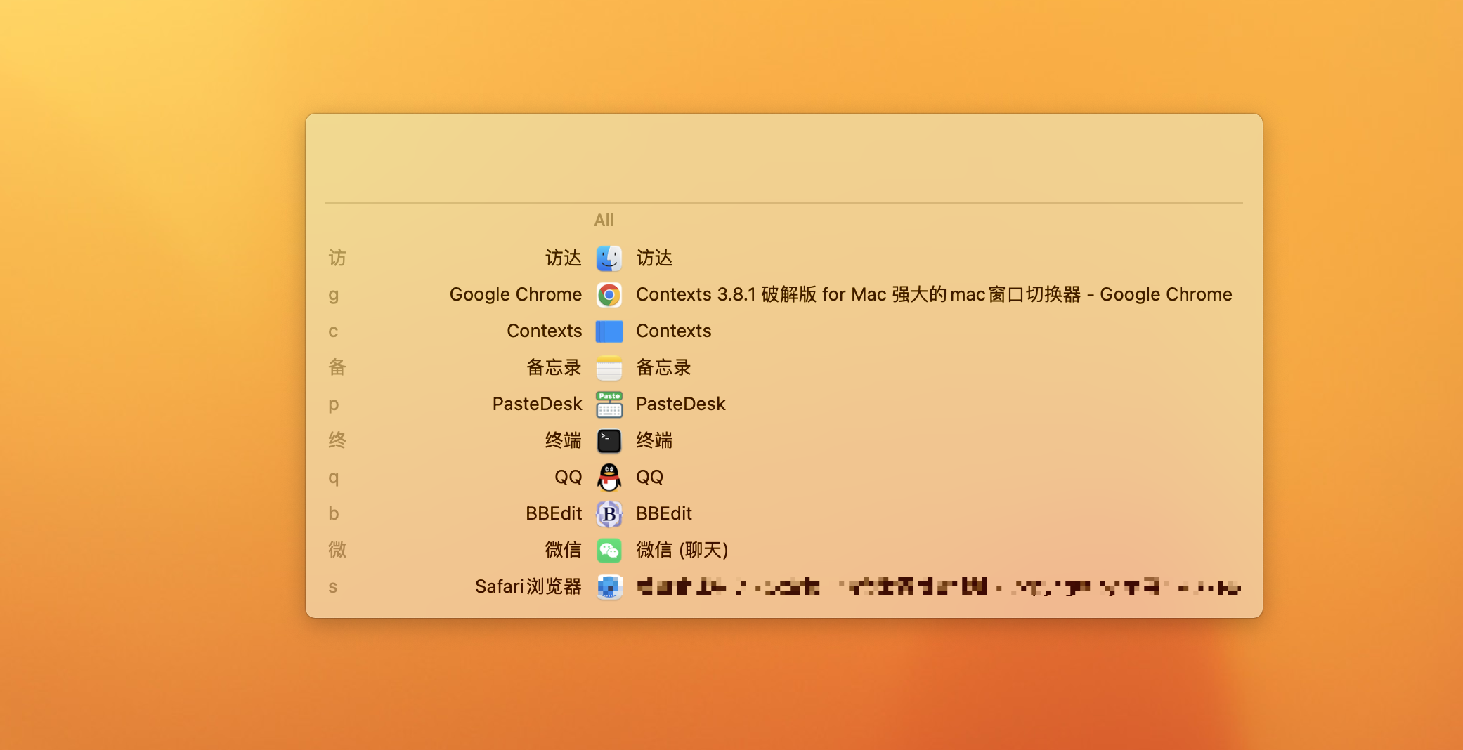 - 如果你的应用程序或窗口开得太多,很难找不到想要的窗口,那么快捷键Control + 空格调出搜索框,直接搜索目标窗口或应用程序的名字就行了,哪怕你只记得窗口名字中的某个字符,Contexts也会迅速把它找到。