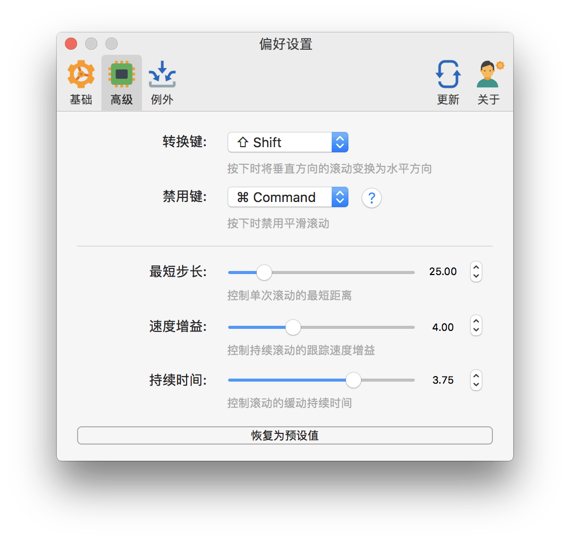 一个用于在 MacOS 上平滑你的鼠标滚动效果或单独设置滚动方向的小工具,让你的滚轮爽如触控板。
