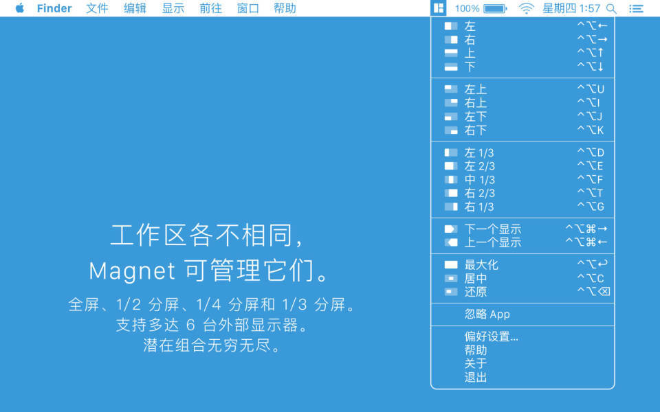 Magnet 同时支持键盘快捷方式,可顺利适配所有命令。您可通过菜单栏上的小图标,找到预定设置或创建自己的设置集。