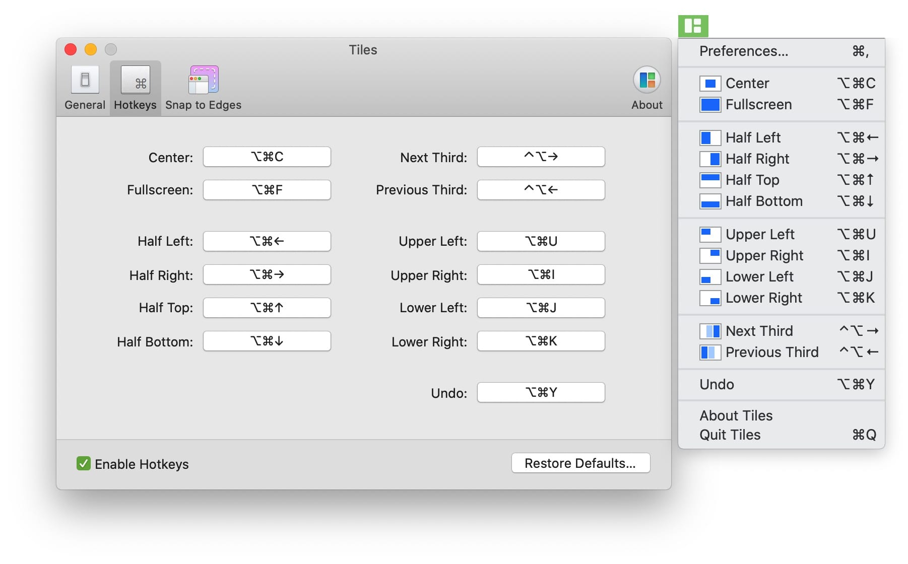 Tiles 是一款 macOS 窗口管理器。通过将窗口拖到屏幕的一侧,它将自动调整大小并放置在适当的位置。例如:尝试将一个窗口拖动到屏幕左侧,它将占用一半的空间。或通过一直向上拖动来最大化窗口。支持通过点击任务栏图标以及键盘快捷键快速切换窗口布局。支持全屏、居中、左右半屏、上下半屏、左上/左下/右上/右下四分之一屏以及3分之1屏。