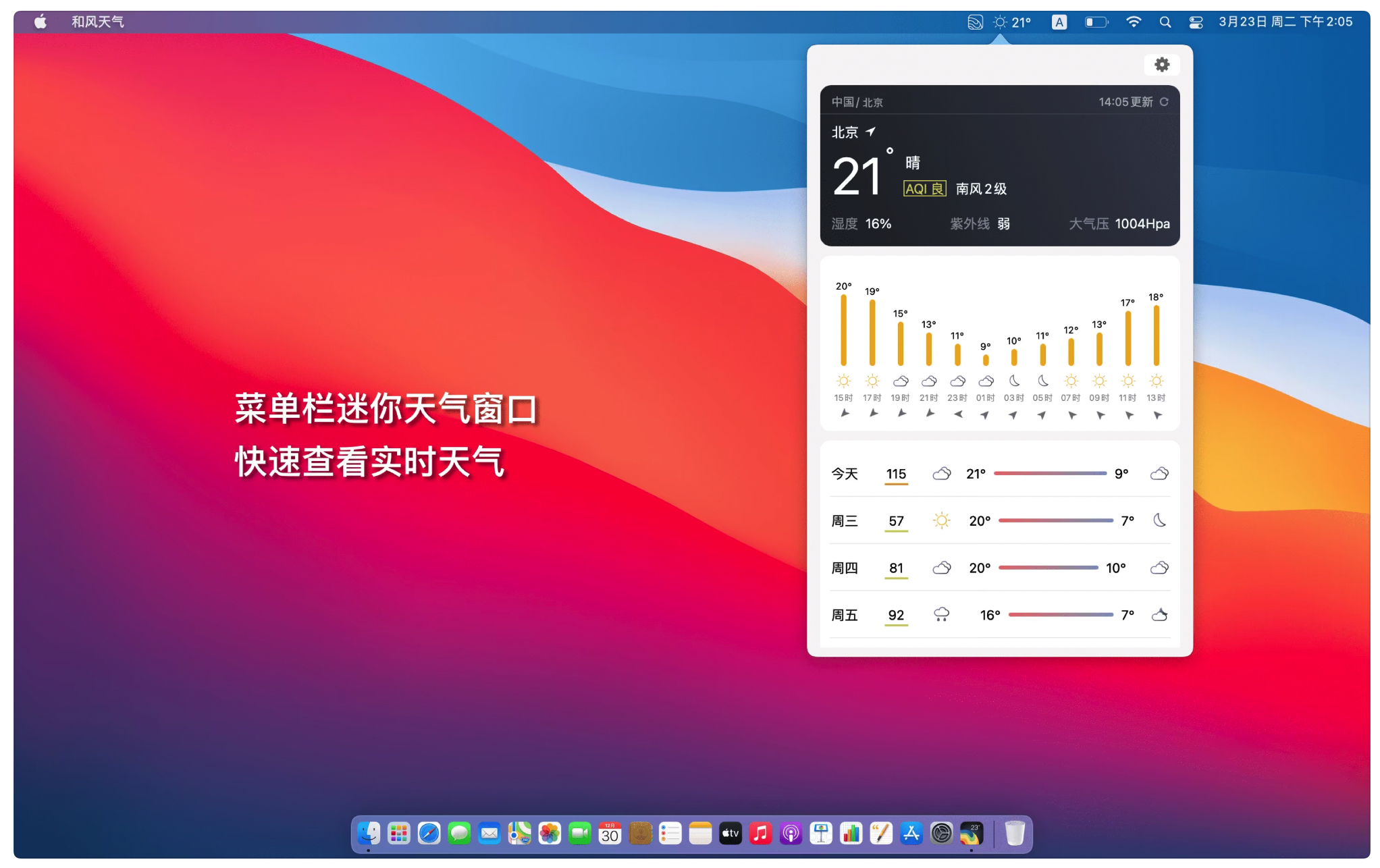 和风天气 (QWeather) 是一款全球可视化、高精度、智慧型 macOS 天气应用。全球可视化天气:温度、降水、空气质量以可视化形式展现给你,直观的感受全球各类天气状况趋势。智慧提醒:完全根据你的习惯设置的天气预报,可针对不同城市不同天气进行提醒,减少无用信息。和风天气支持菜单栏显示当前或指定城市的实时温度和天气状况 以及 Big Sur 小组件 (测试没有)。支持iPhone/iPad/Apple Watch和Mac多端数据同步。丰富的天气功能:灾害预警、逐天和逐小时预报、实况天气、空气质量、降水量、大气压、相对湿度、能见度、日出日落、月升月落等等等等…