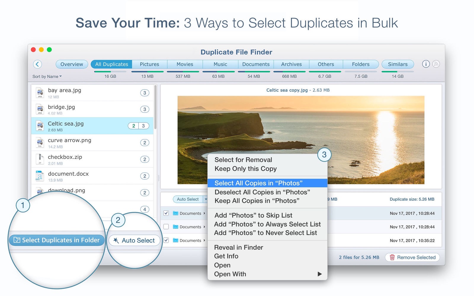 全部或按组选择不需要的重复文件。 你也可以点击“自动选择”按钮快速完成清理,或者使用“选择文件夹中的文件”选项指定要删除的重复文件夹。