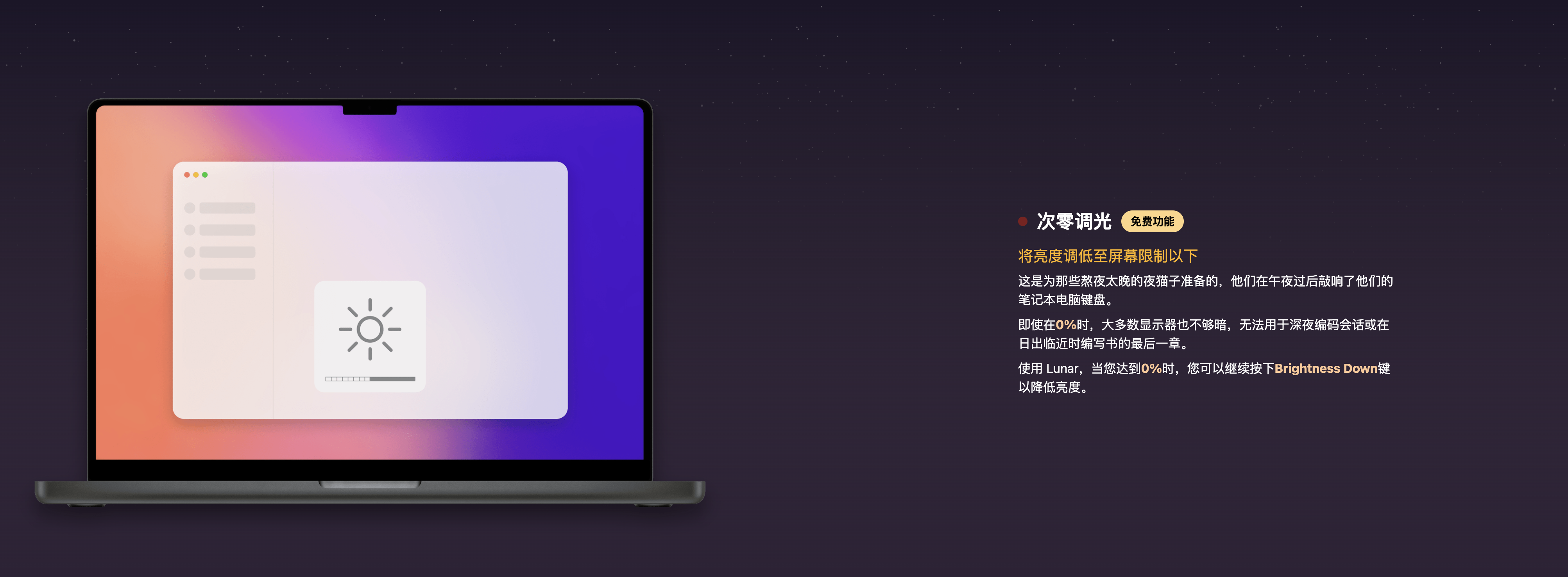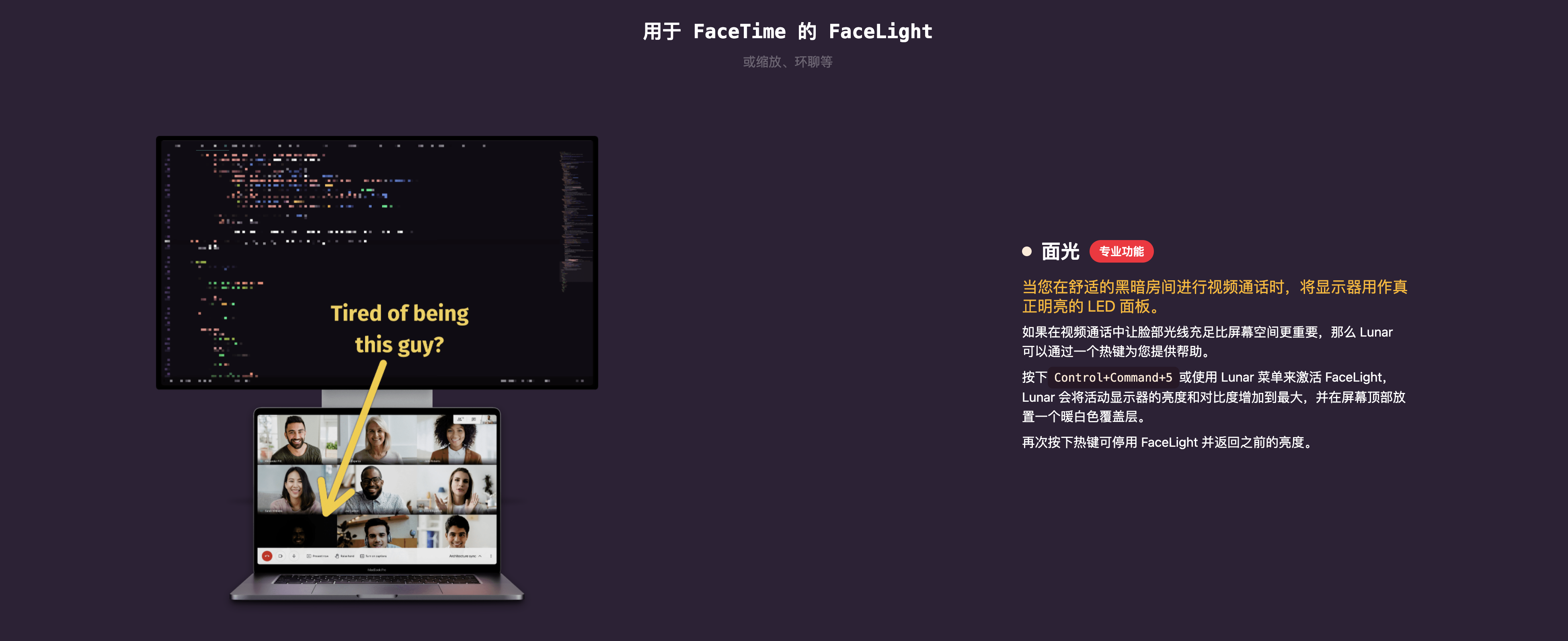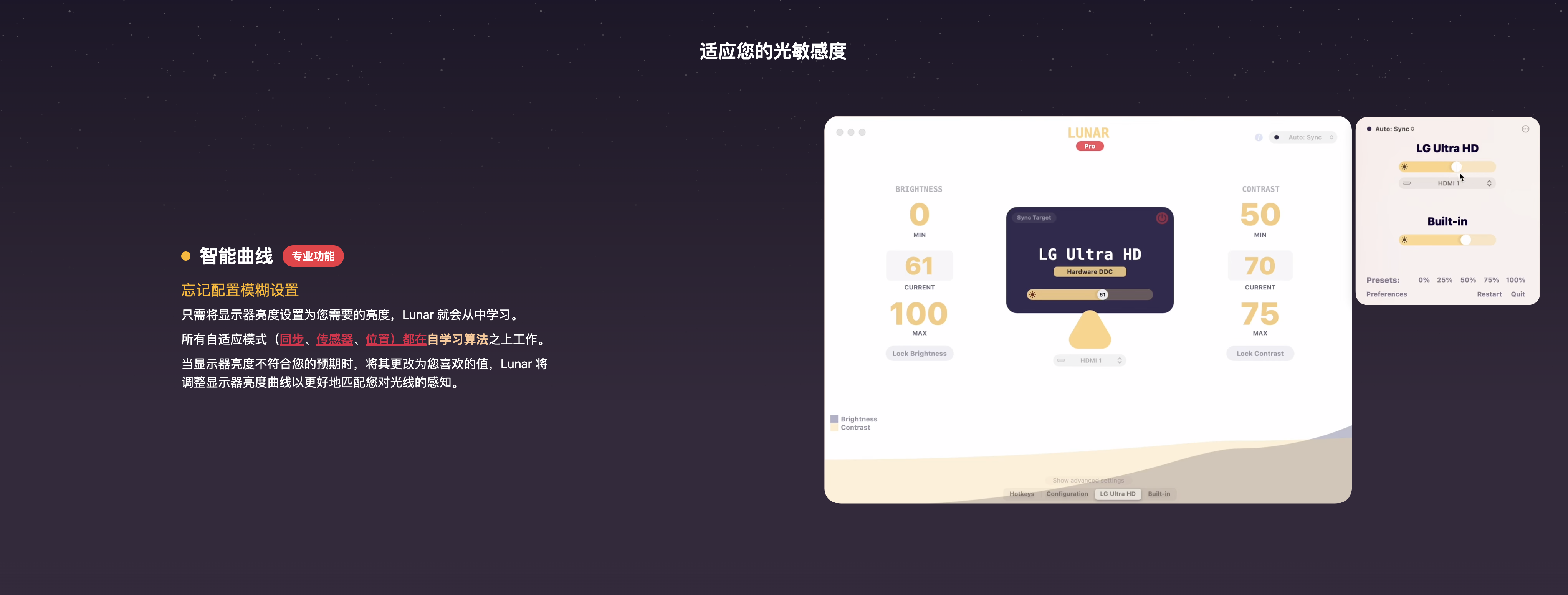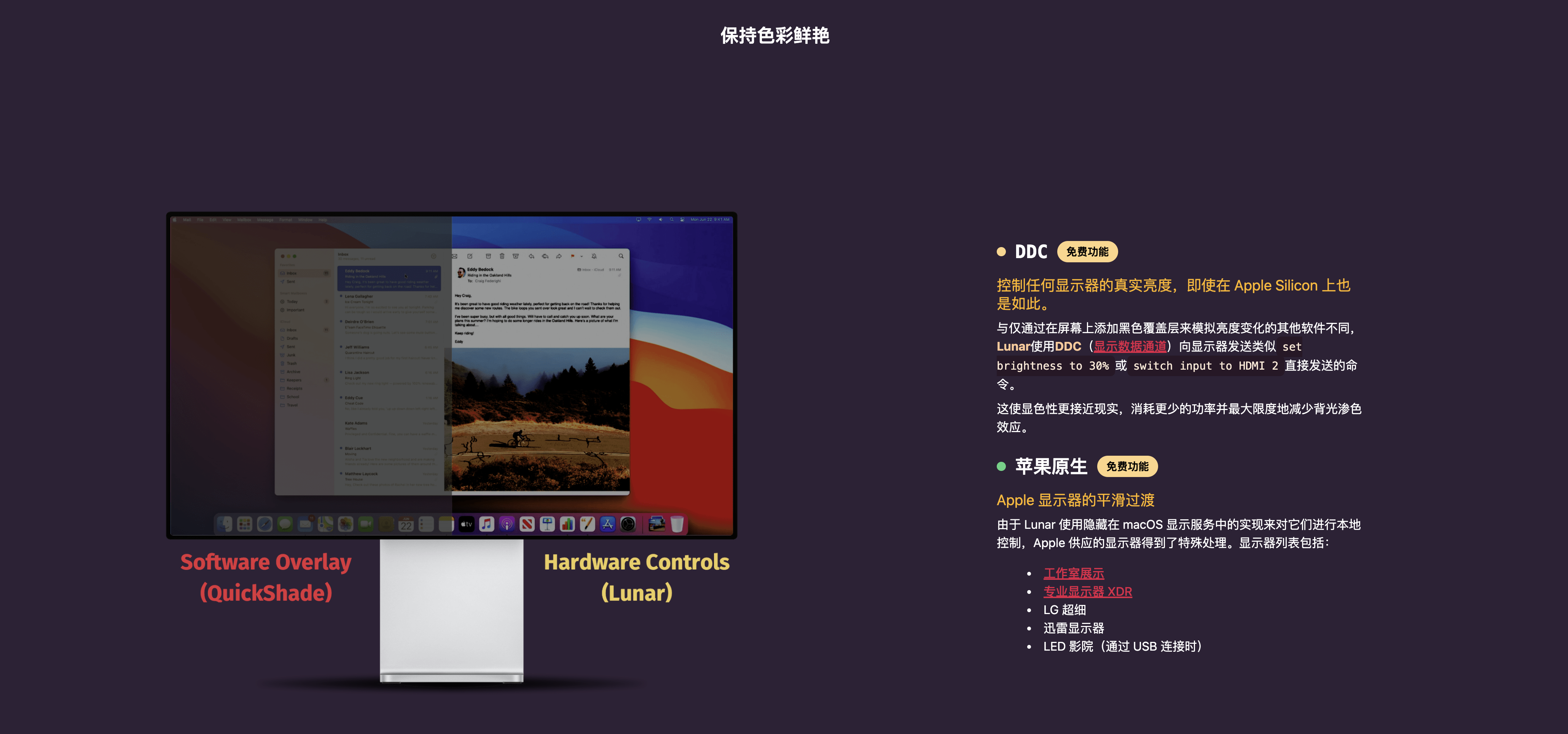 Lunar Pro 是搜集到的一款适用于 macOS 的外接显示器亮度和显示器音量调节工具。与其他仅通过在屏幕上添加黑色覆盖层来模拟亮度变化的软件不同, Lunar 使用 DDC(显示数据通道)向显示器发送类似 set brightness to 30% 或 switch input to HDMI 2 命令来实现。这个应用功能非常强大,建议去其官方网站详细了解。