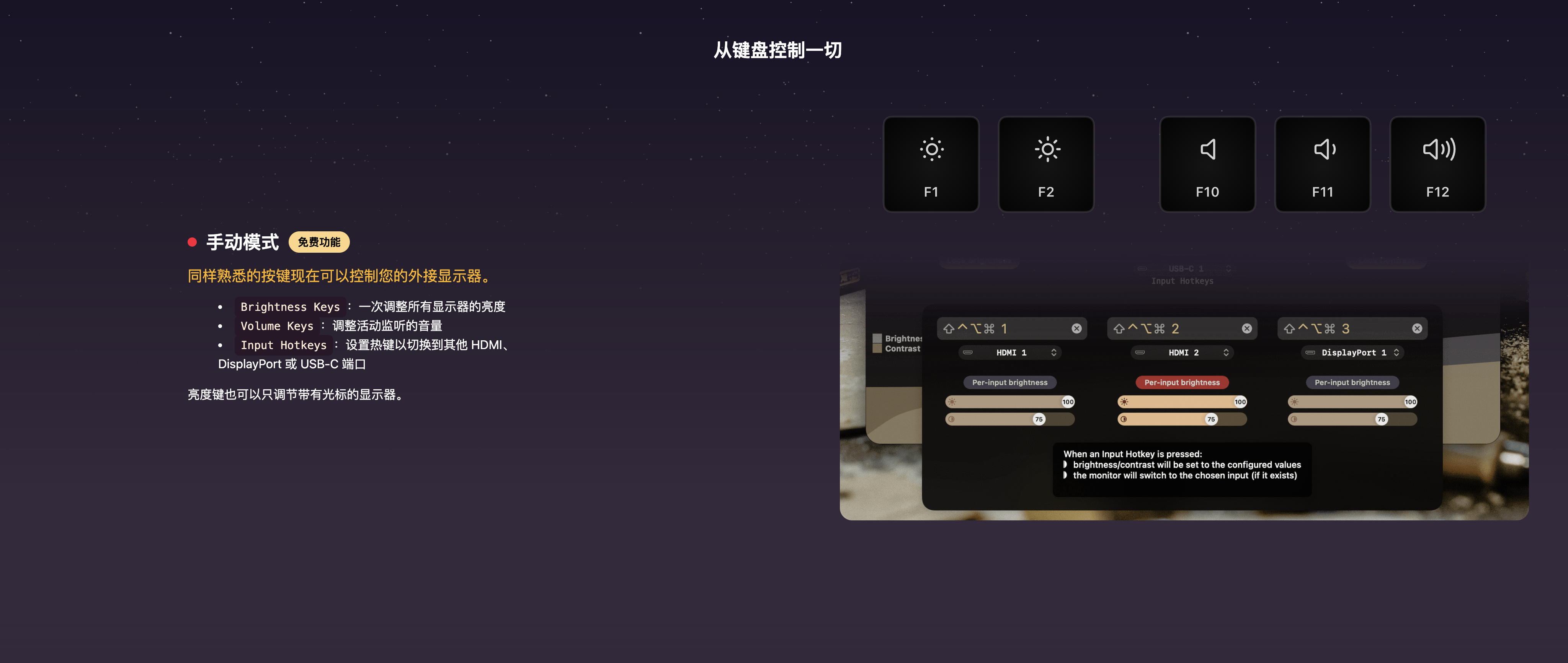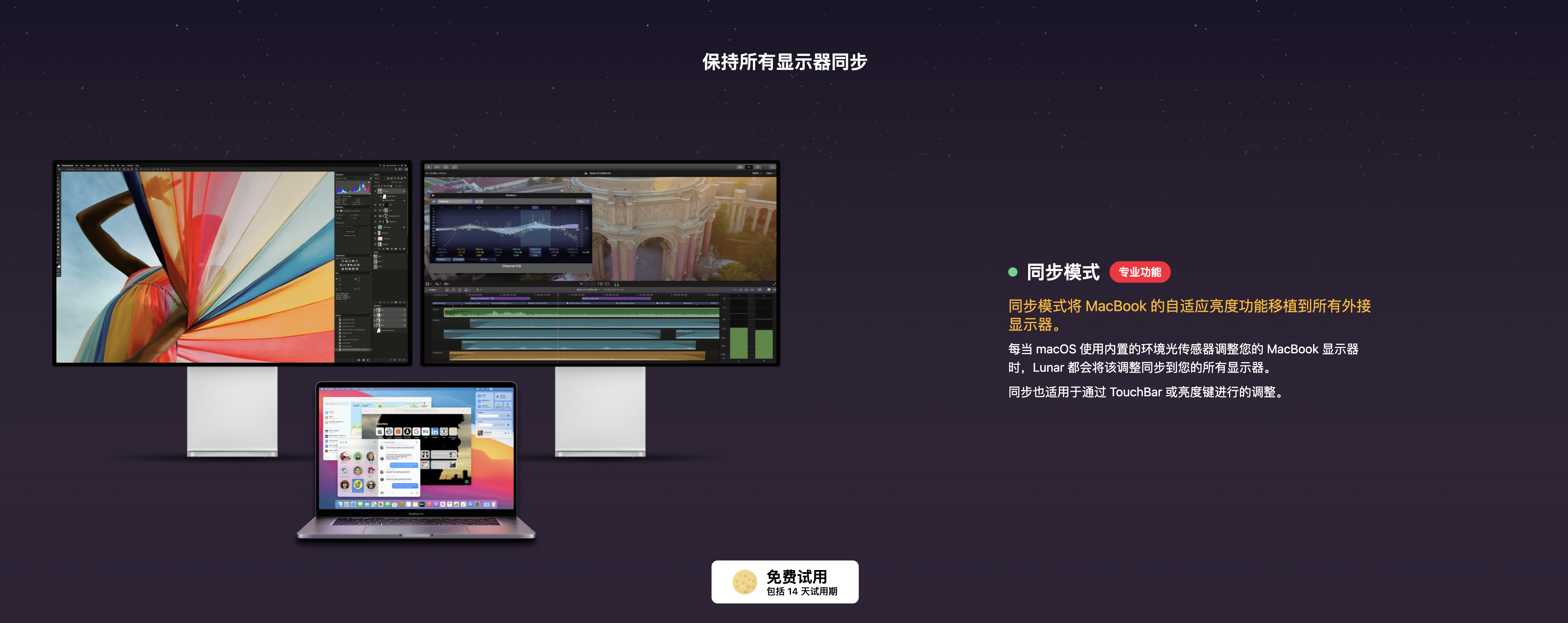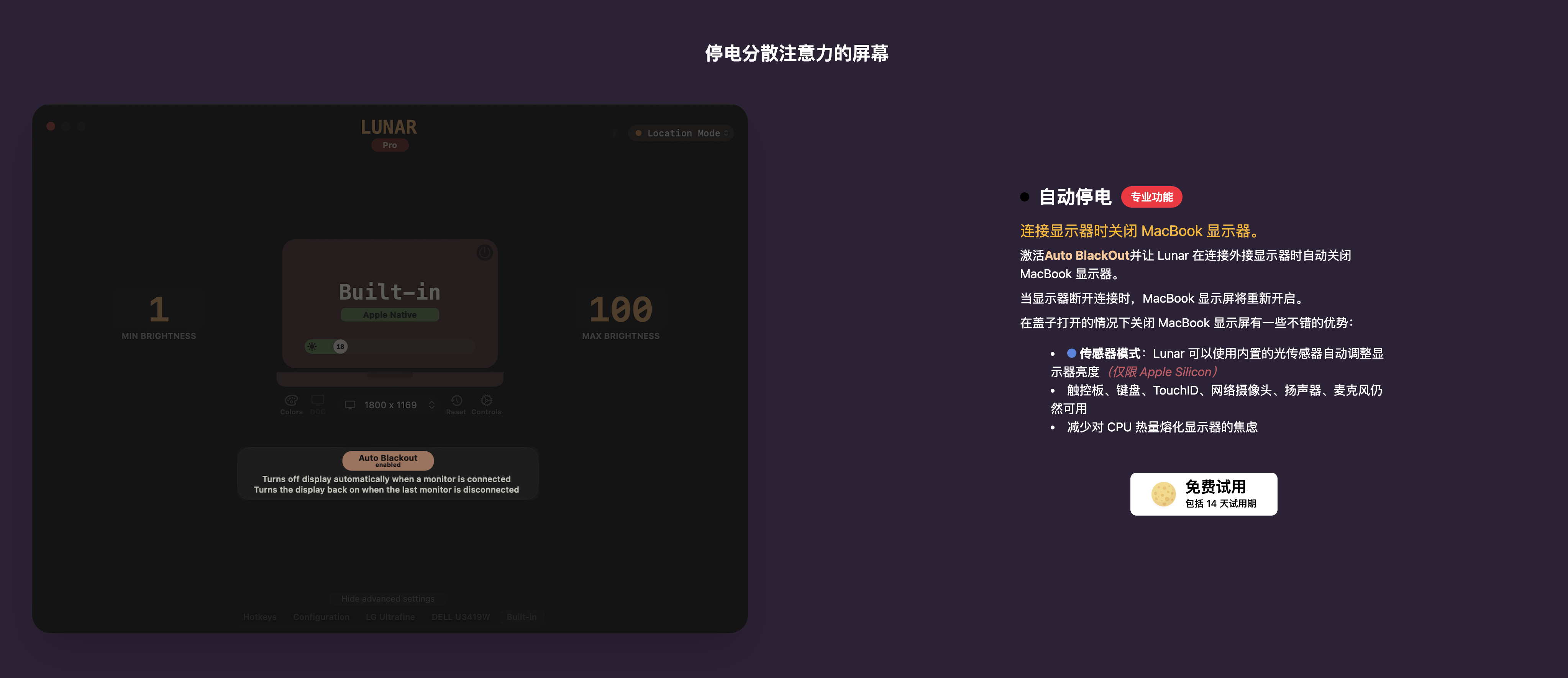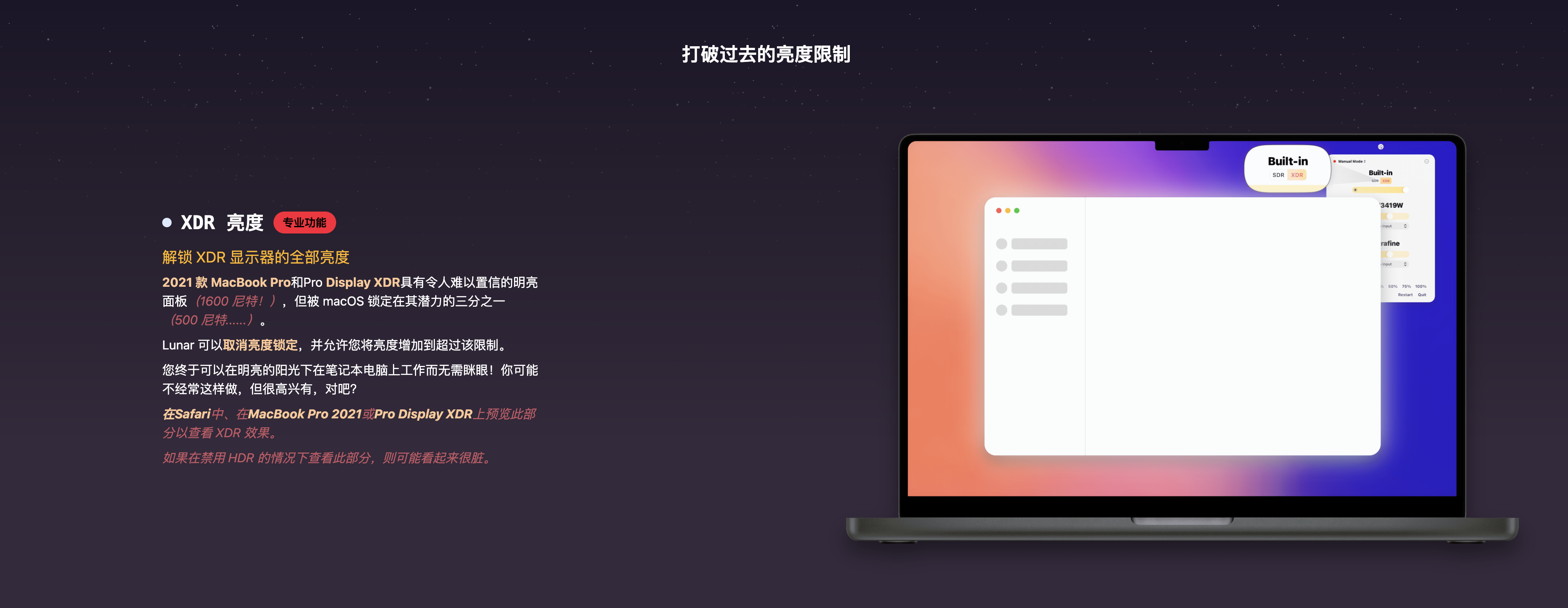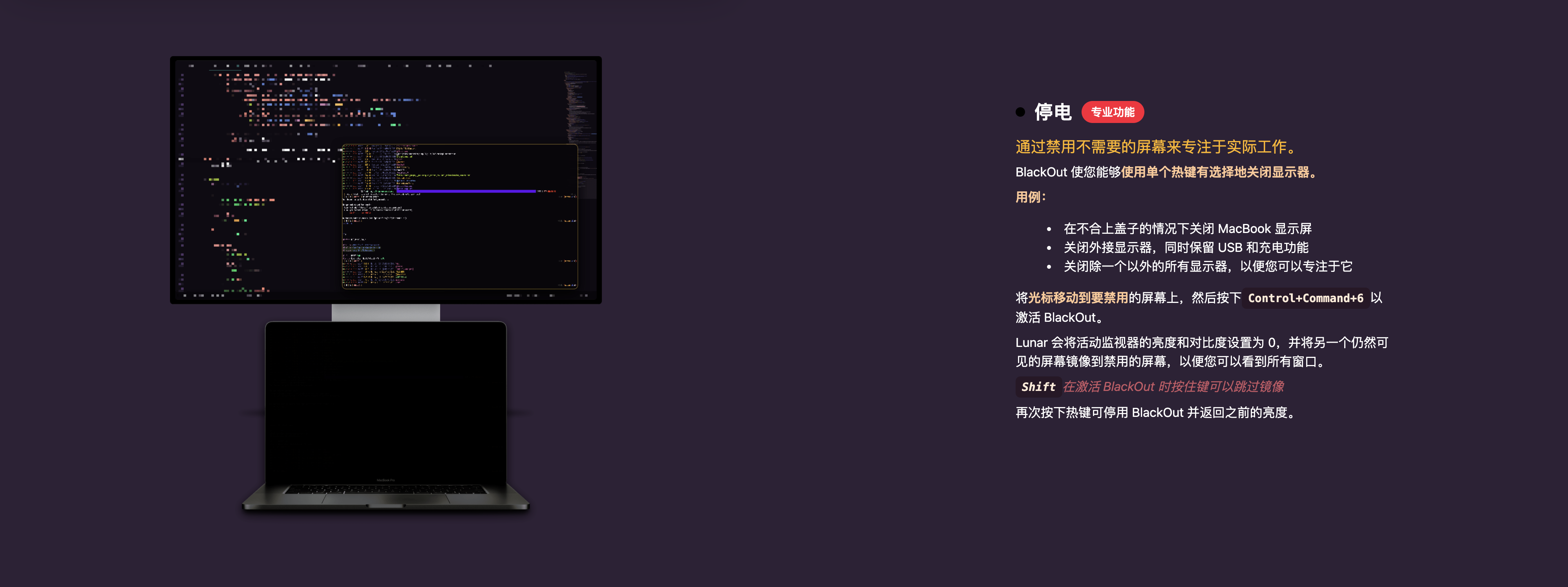 Lunar Pro 是搜集到的一款适用于 macOS 的外接显示器亮度和显示器音量调节工具。与其他仅通过在屏幕上添加黑色覆盖层来模拟亮度变化的软件不同, Lunar 使用 DDC(显示数据通道)向显示器发送类似 set brightness to 30% 或 switch input to HDMI 2 命令来实现。这个应用功能非常强大,建议去其官方网站详细了解。