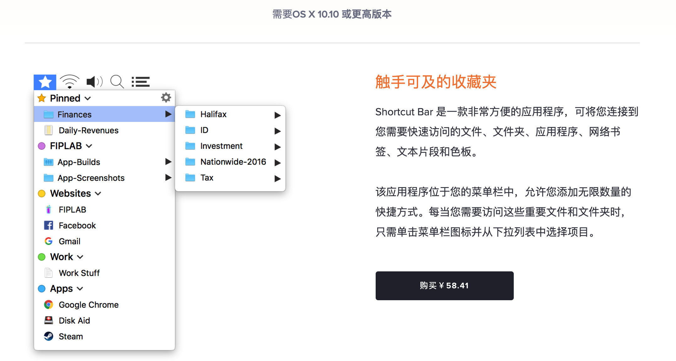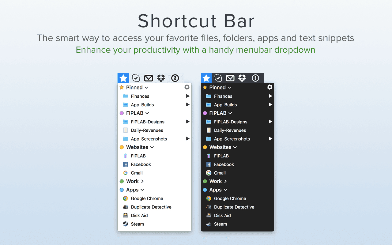 Shortcut Bar可以帮助我们在mac电脑上实现文件和文件夹快速访问和快速启动,支持分类整理,完全按照自己的意愿设定需要快速访问的文件、文件夹以及应用程序,直接通过在菜单栏实现快速访问或是快速启动。