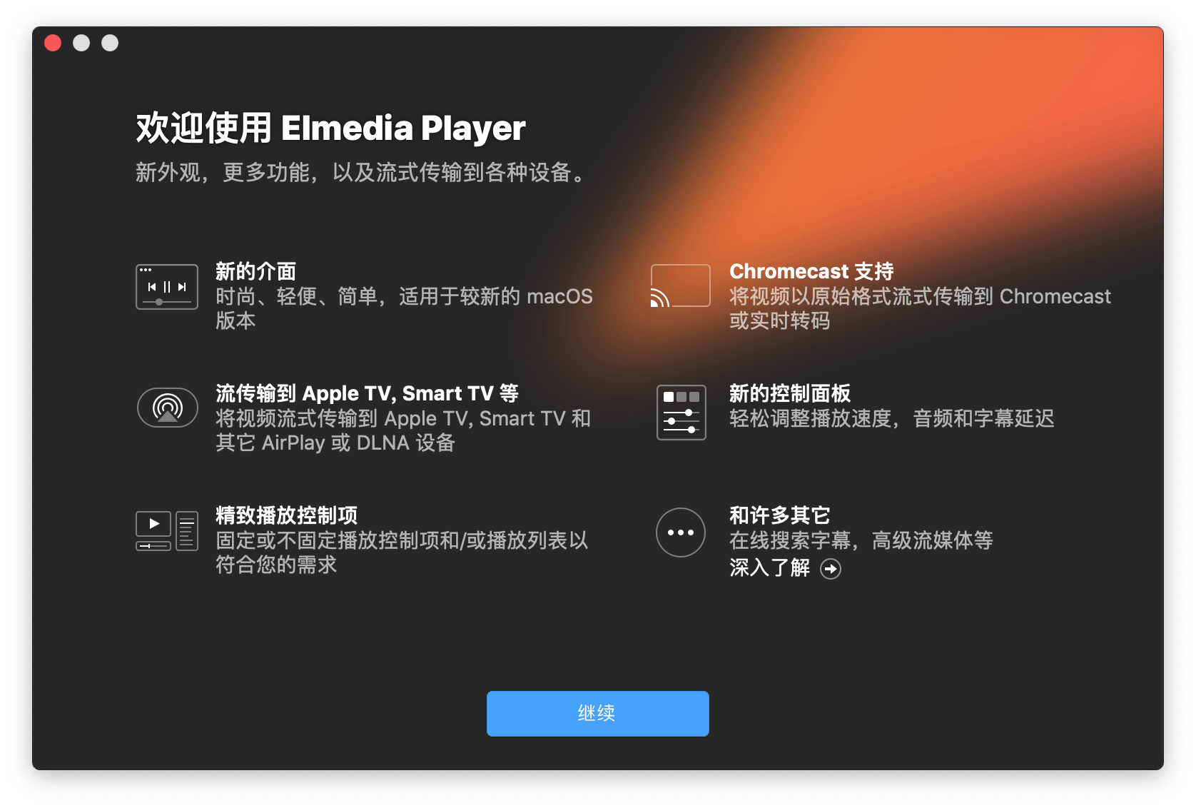 Elmedia Player 是 Mac 的顶级解决方案,支持 Chromecast,AirPlay 和 DLNA 等无线技术,可让您快速轻松地将媒体文件从计算机传输到智能电视或任何其他 AirPlay,Chromecast 和 DLNA 兼容设备。该应用程序还可以从 Mac 计算机,AirPlay 设备和 iTunes 接收流。使用 AirPlay 技术,您可以将音乐从智能手机发送到 Mac 上的Elmedia Player,并连接更大的扬声器以获得更好的声音。