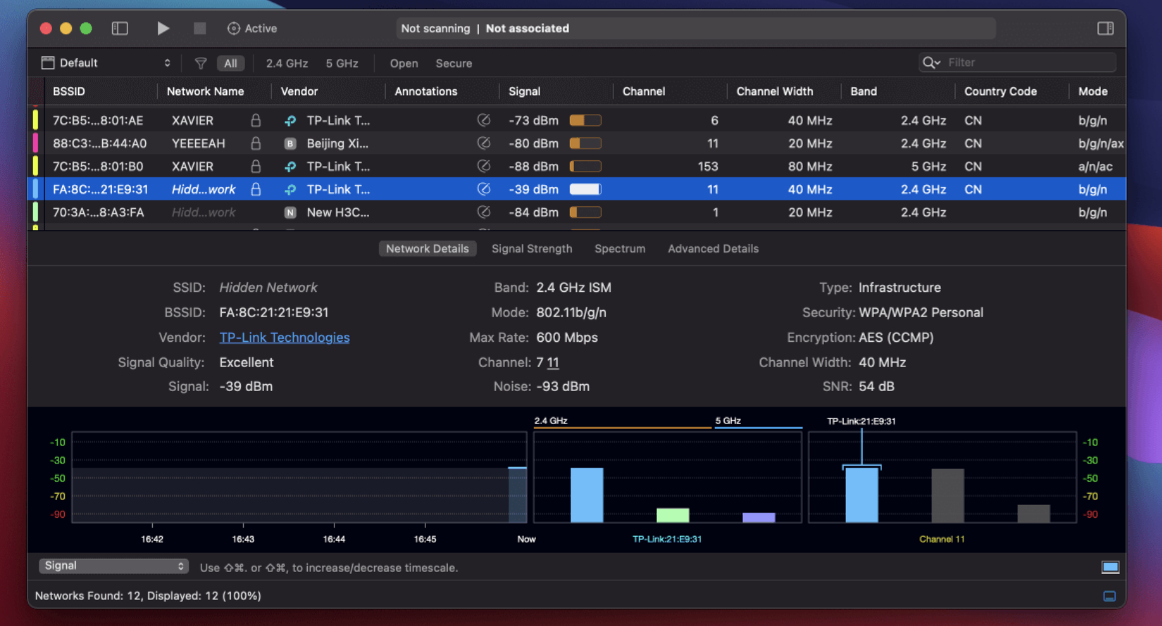 WiFi Explorer 是一款搜集到的WiFi无线信号扫描和管理工具,可以查看周围所有WiFi信号源的详细报销,包括SSID名称、MAC地址、设备制造商、信号强度、信号通道等等信息,能够帮助我们解决渠道冲突、信号重叠或配置问题,非常不错的一款WiFi网络扫描管理工具!