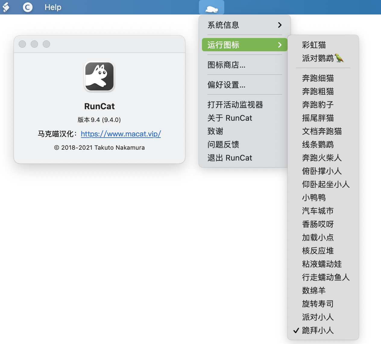 当然,RunCat 最大的亮点还是菜单栏的动画,它能根据 Mac 的 CPU 使用率更改帧速度,默认已有20款免费动画,还可以在 Runners Store 中购买你喜欢的动画,此外还你可以自已制作动画,自定义图标。
