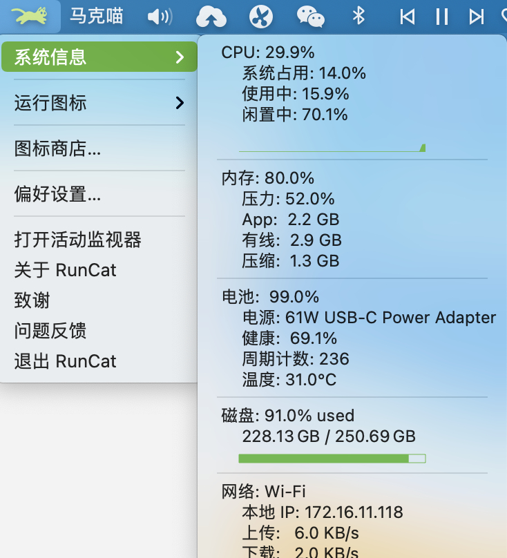 RunCat 可以显示系统的Cpu、磁盘、网络的基本信息,让你对你的mac了如指掌。
