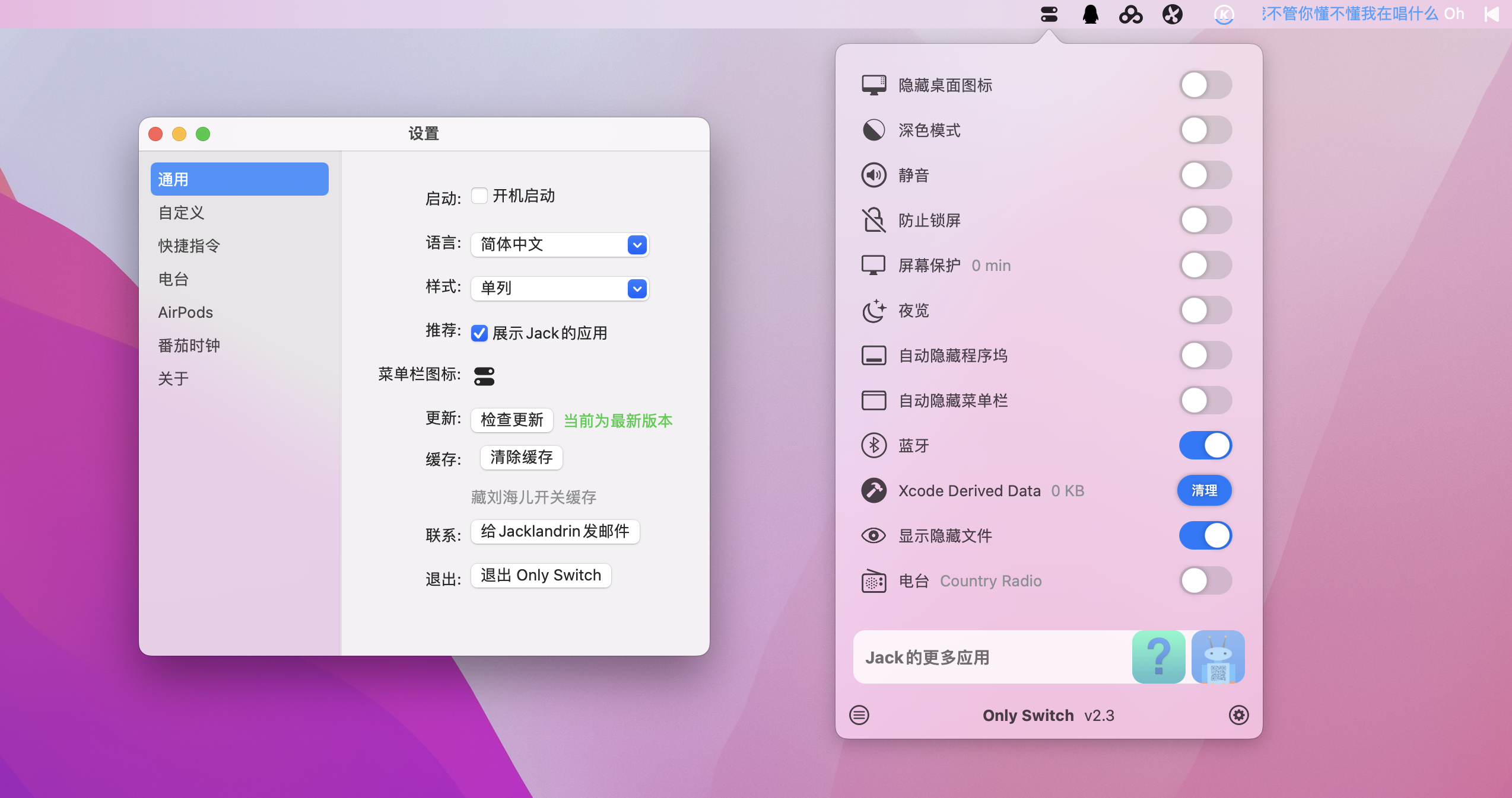 Only Switch是搜集到的一款菜单栏快捷功能软件,Only Switch 可以帮你一键切换系统各项设置,提升效率。 Only Switch 可以通过菜单栏快捷菜单可一键快速实现隐藏桌面、保持亮屏、切换 AirPods、显示隐藏文件等功能。