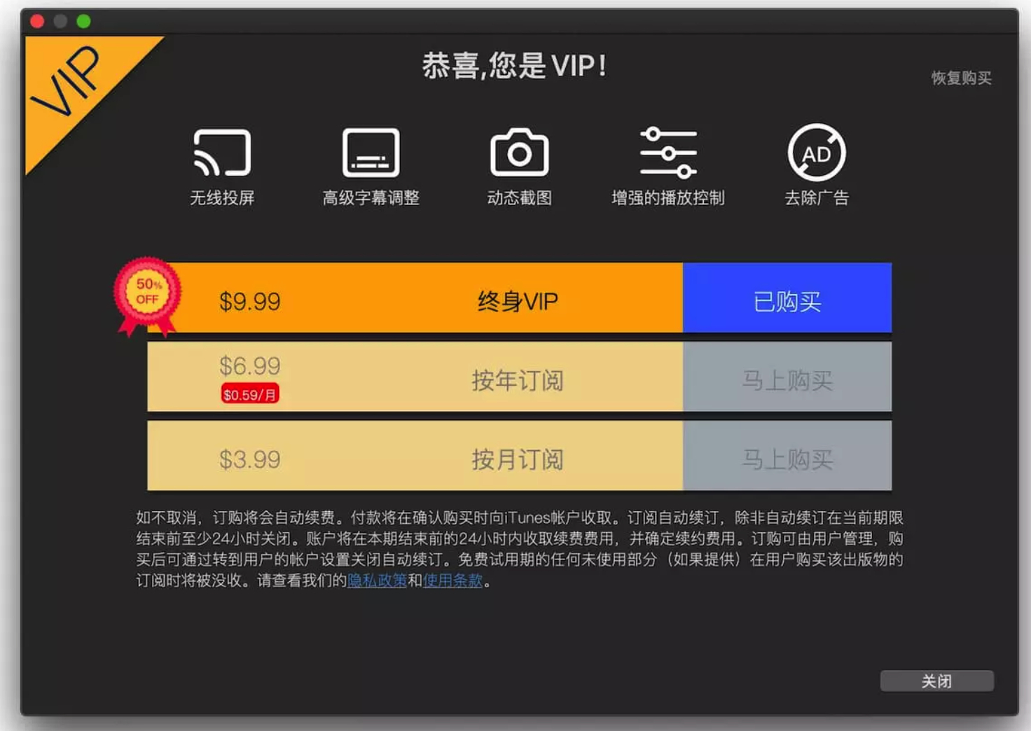OmniPlayer 的 VIP 功能包含了以下一些功能,其余功能均免费使用: