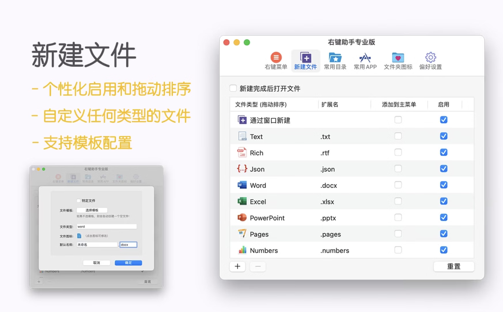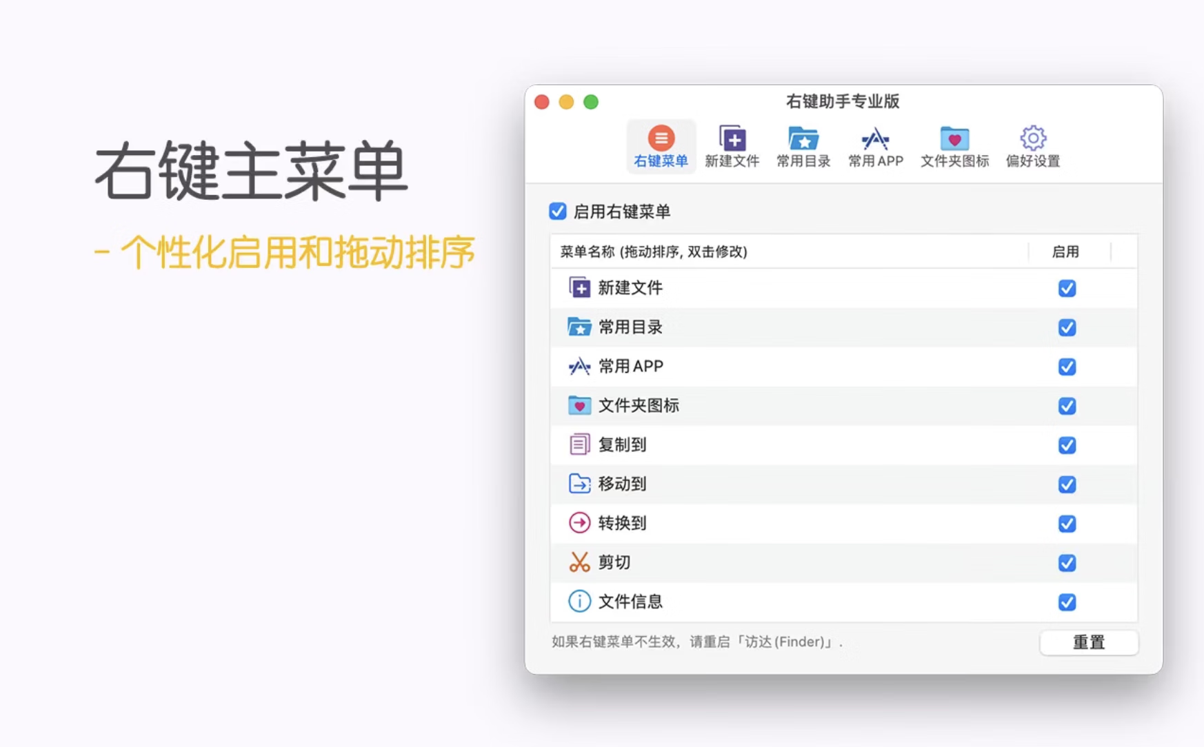 另外,右键助手的自定义功能非常强大,您可以根据您的喜好,对右键菜单自行排列,禁用您不常用的菜单,您还可以把常用的APP和经常需要创建的文件类型添加到主菜单中,提高工作效率!如果您对菜单栏的默认命名不满意的话,您也可以自定义修改!