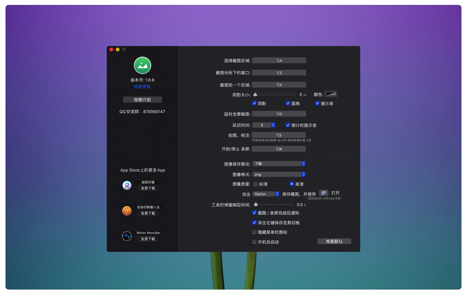 支持截图自动导圆角、截图阴影可进行颜色、大小调节。