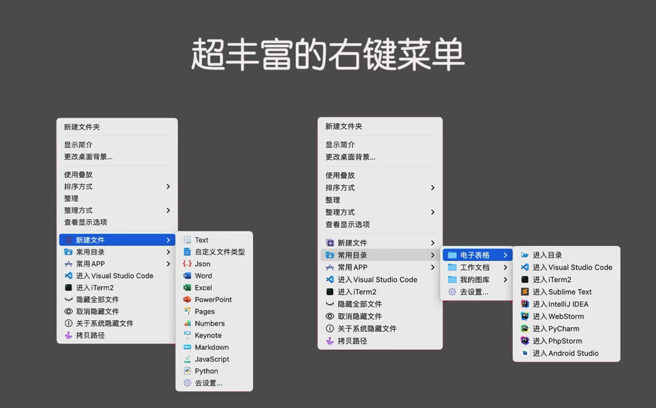 – 快速打开VSCode,Sublime Text,Emacs,PhpStorm,PyCharm,IDEA,WebStorm 等。