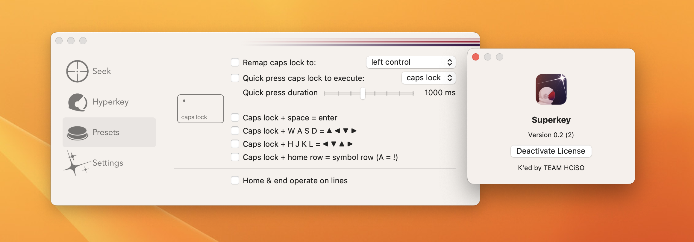 超级键 将您的大写锁定键或任何修饰键转换为超级键,所有四个修饰符组合在一起:⌃⌥⌘⇧