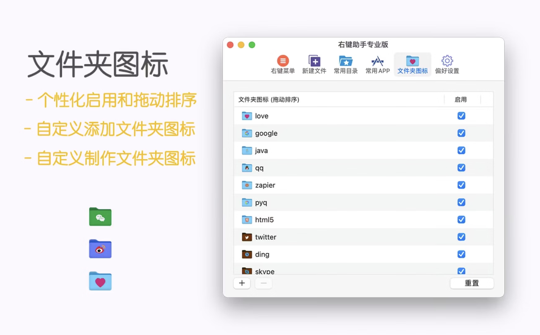 如果您想要对某些文件夹进行特殊标识,或者您对系统文件夹图标看厌了的话,那么您完全可以给它们换一种您喜欢的显示风格。右键助手内置了 20 多种图标风格,如果不合您胃口的话,您完全可以自定义设置哦!