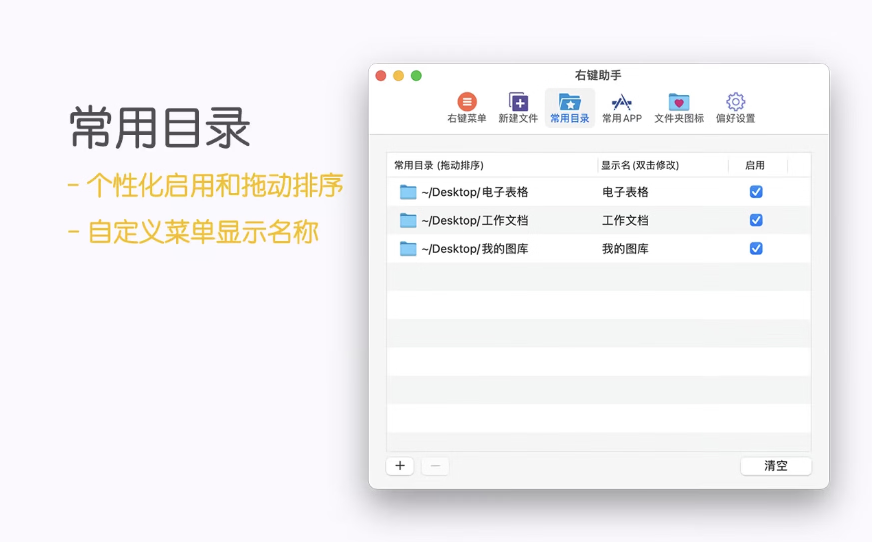 在工作中,我们经常性的会把一些常用的文件或文件夹放到桌面,时间久了,你会发现自己的桌面非常乱,想要找一个文件非常困难。有了右键助手,您就可以把自己常用目录放到某个位置,然后把该目录添加到右键助手中,以后想要打开,轻点右键即可快速打开该目录和其子目录文件,另外,您还可以自定义设置通过常用APP来打开该目录哦,操作非常便捷!