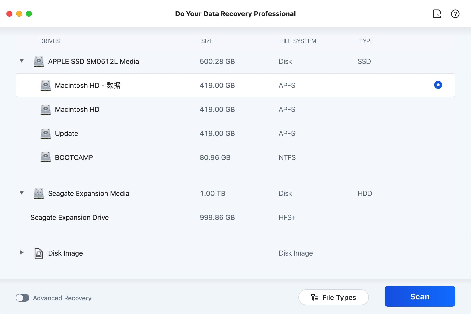 搜集到一款Do Your Data Recovery是一款专业可靠安全的数据恢复软件,可以帮助您轻松快速地恢复丢失的文件从Mac笔记本电脑,台式机,基于Mac的驱动器,数码设备,可移动设备由于删除,格式化,病毒攻击,操作系统崩溃,操作不当或其他原因不明。