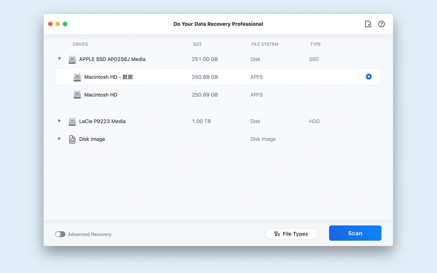 为Mac专业数据恢复分享两种恢复模式 – 快速恢复和高级恢复,以确保找到丢失的所有丢失的文件。虽然快速恢复可以快速找到已删除或最近丢失的文件,但高级恢复将更深入地扫描您的设备并找到更多丢失的文件。