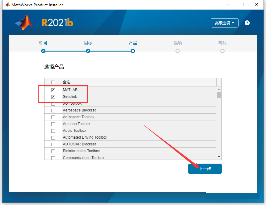 9.产品自行按需选择,这里我象征性地选择两个最基本的模块,点击【下一步】