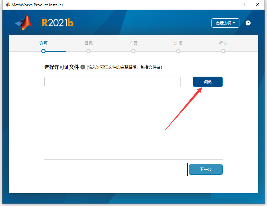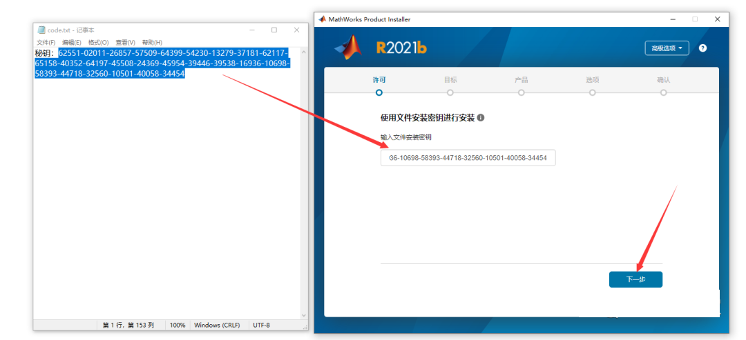 5.将安装包中的code文件的内容复制粘贴,点击【下一步】(若你的程序显示不是文件安装密钥则需点击右上角高级选项进行选择)