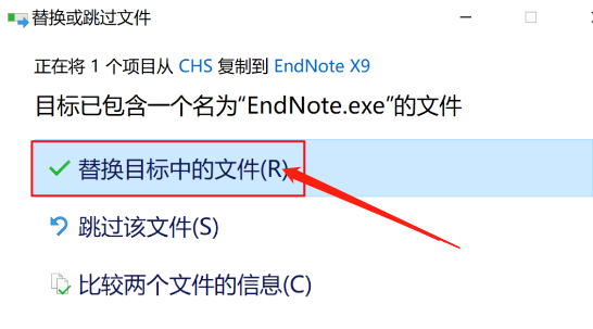 9、打开步骤6的安装位置,粘贴【EndNote.exe】文件,选择替换目标中的文件。这样Endnote就变成中文版了。(英文版是同样方法,也可以中英文版本相互更换)