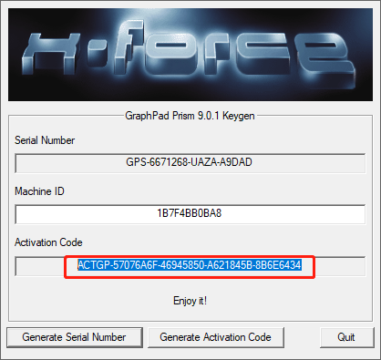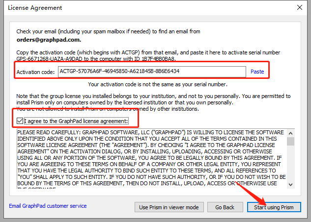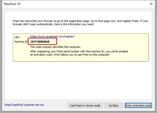 14.返回软件的Machine ID页面,点击【Enter activation code】.将第18步复制的内容,粘贴到Activation code文本款内,勾选【I agree to the GraphPad license agreement】,点击【Start using Prism】