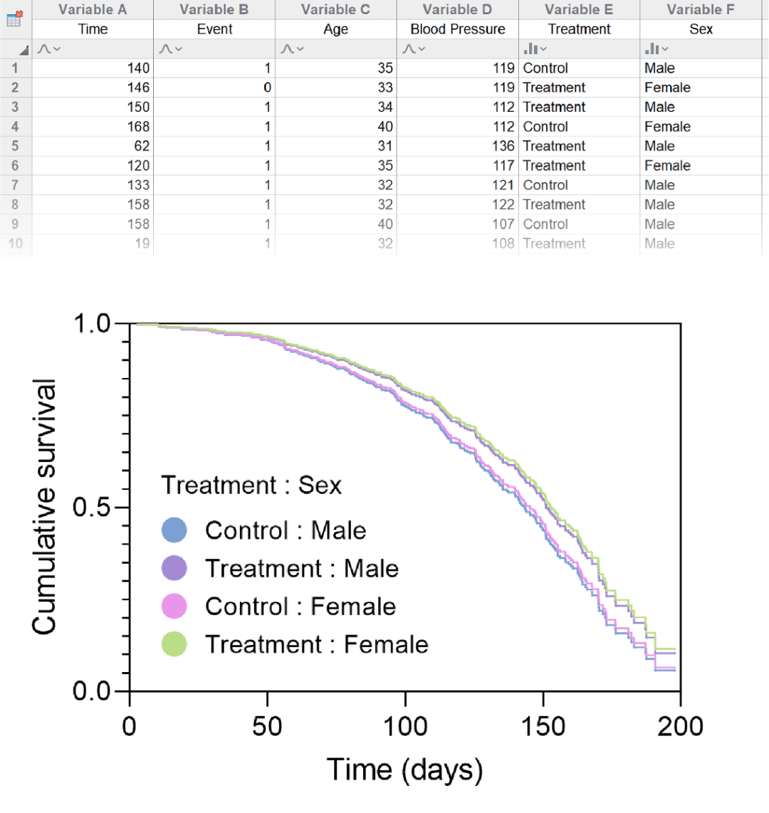 长期以来,Prism提供了一种非常简单的生存分析形式,即使用Kaplan-Meier生存估计。然而,这种方法仅限于创建假定为同质的人群的生存曲线,并且这种方法不包括可能在研究中为个体收集的预测变量的值(如年龄、种族、治疗组等)。虽然使用Kaplan-Meier方法生成的不同组(即“治疗”组和“控制”组)的生存曲线可以进行统计比较,但无法将连续预测变量(如年龄、血压、体重等)纳入这些估计中。