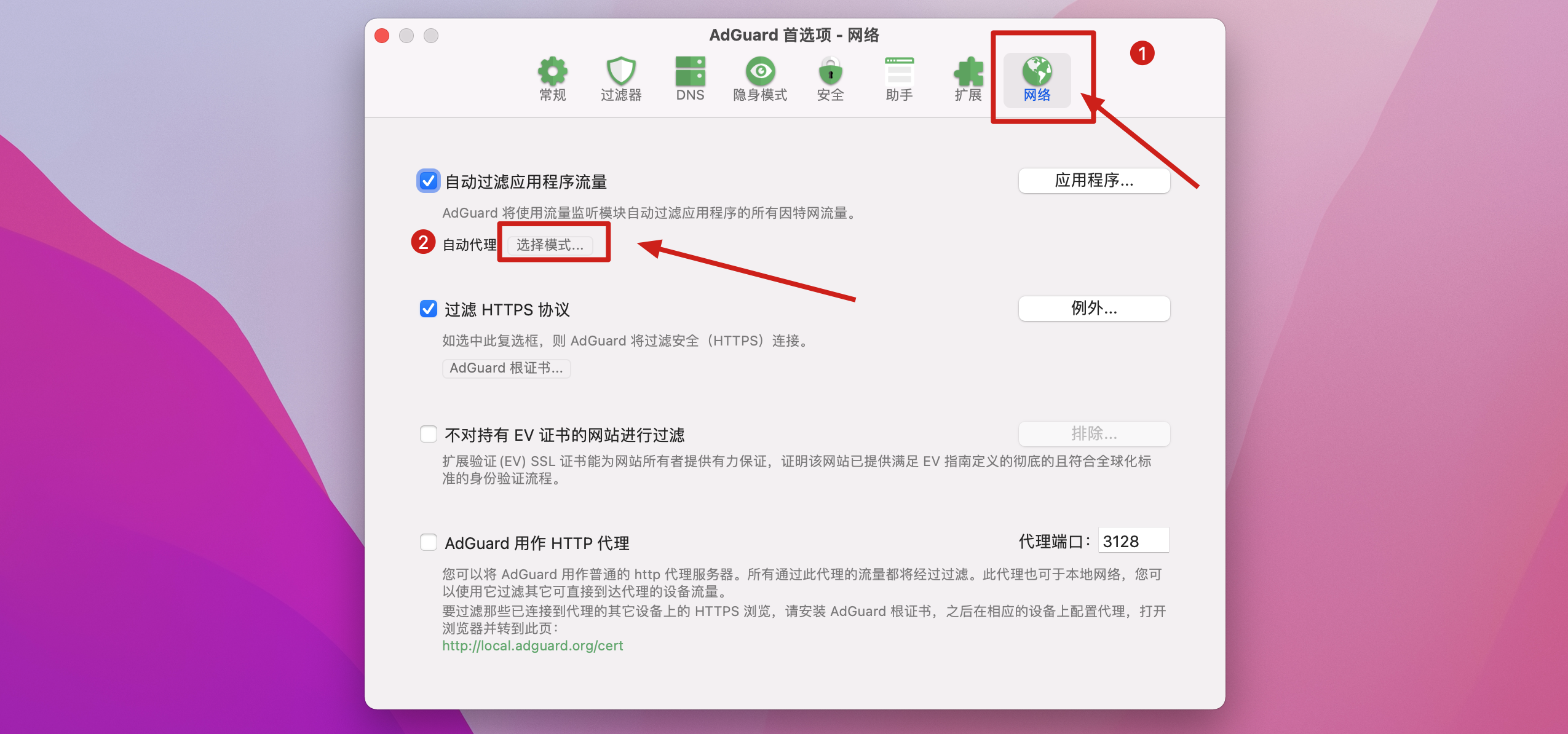 设置里进入首选项,选择网络标签,点击网络扩展后的选择模式,改为自动代理即可